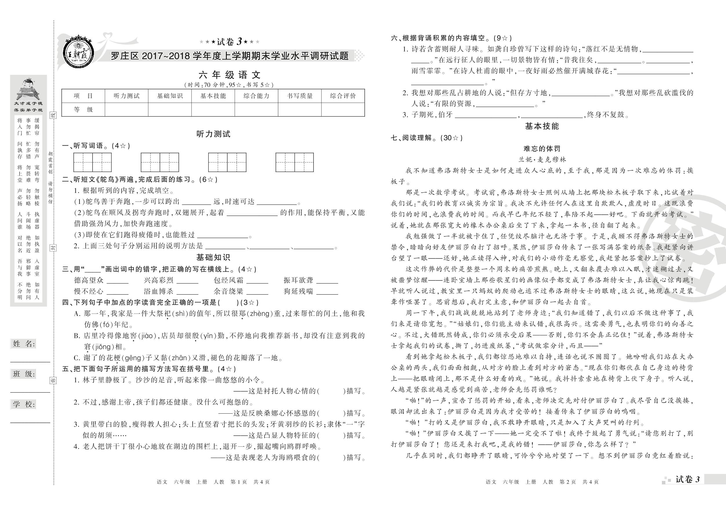 2017-2018学年第一学期临沂市罗庄区六年级语文试卷(人教版)【3】