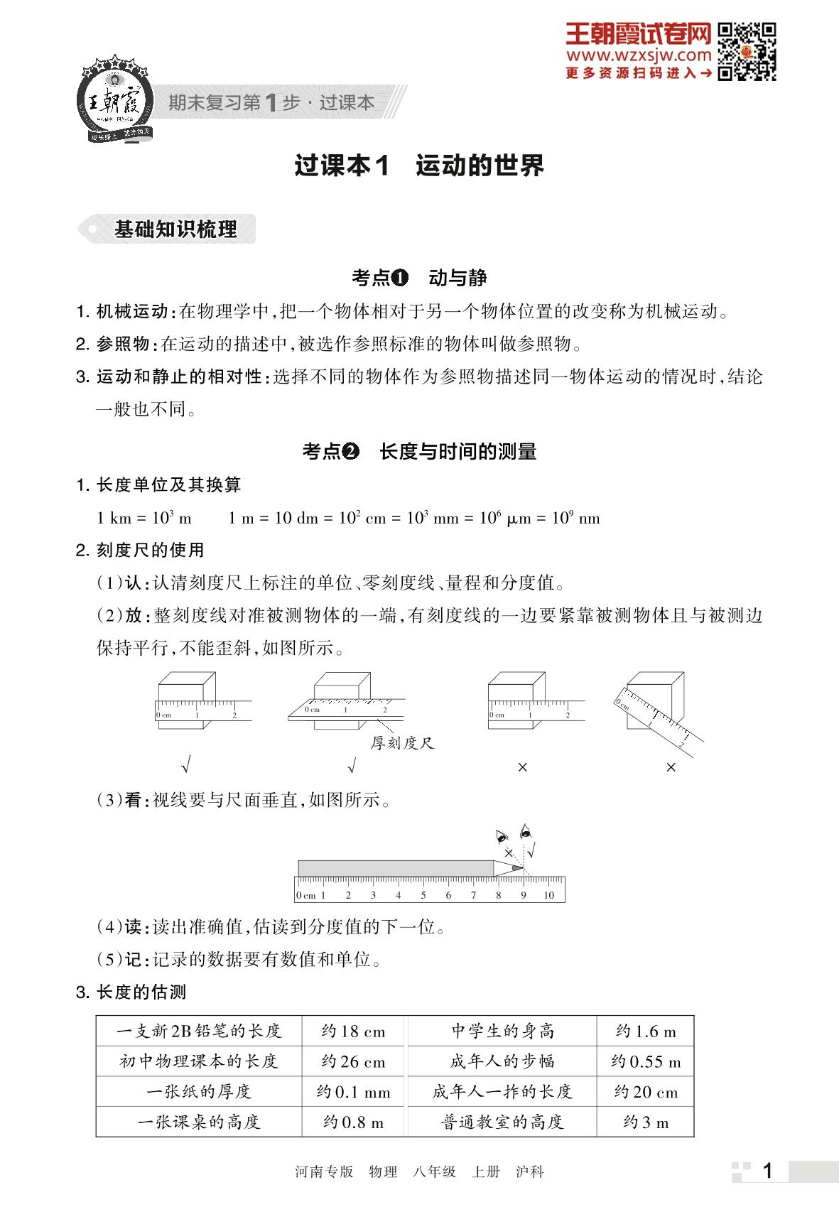 王朝霞期末过课本——1 运动的世界八年级上册物理(沪科版)