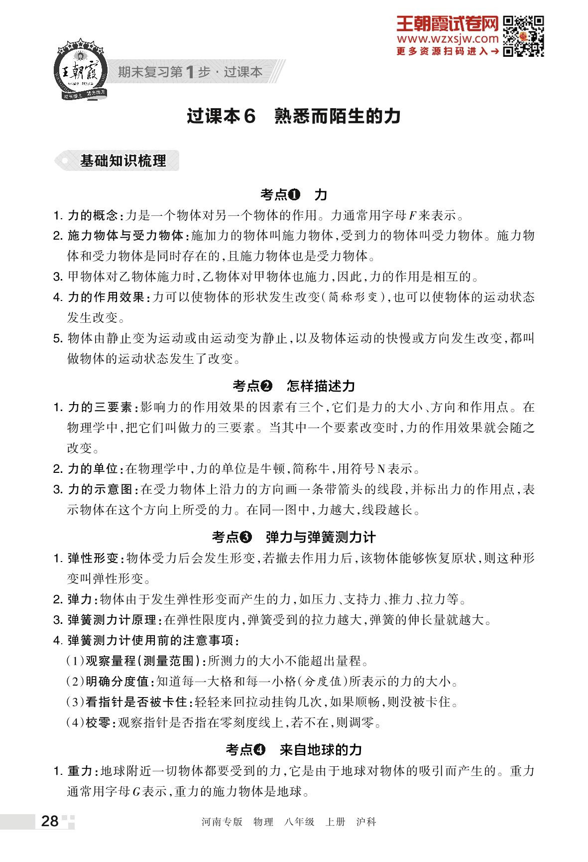 王朝霞期末过课本——6 熟悉而陌生的力八年级上册物理(沪科版)