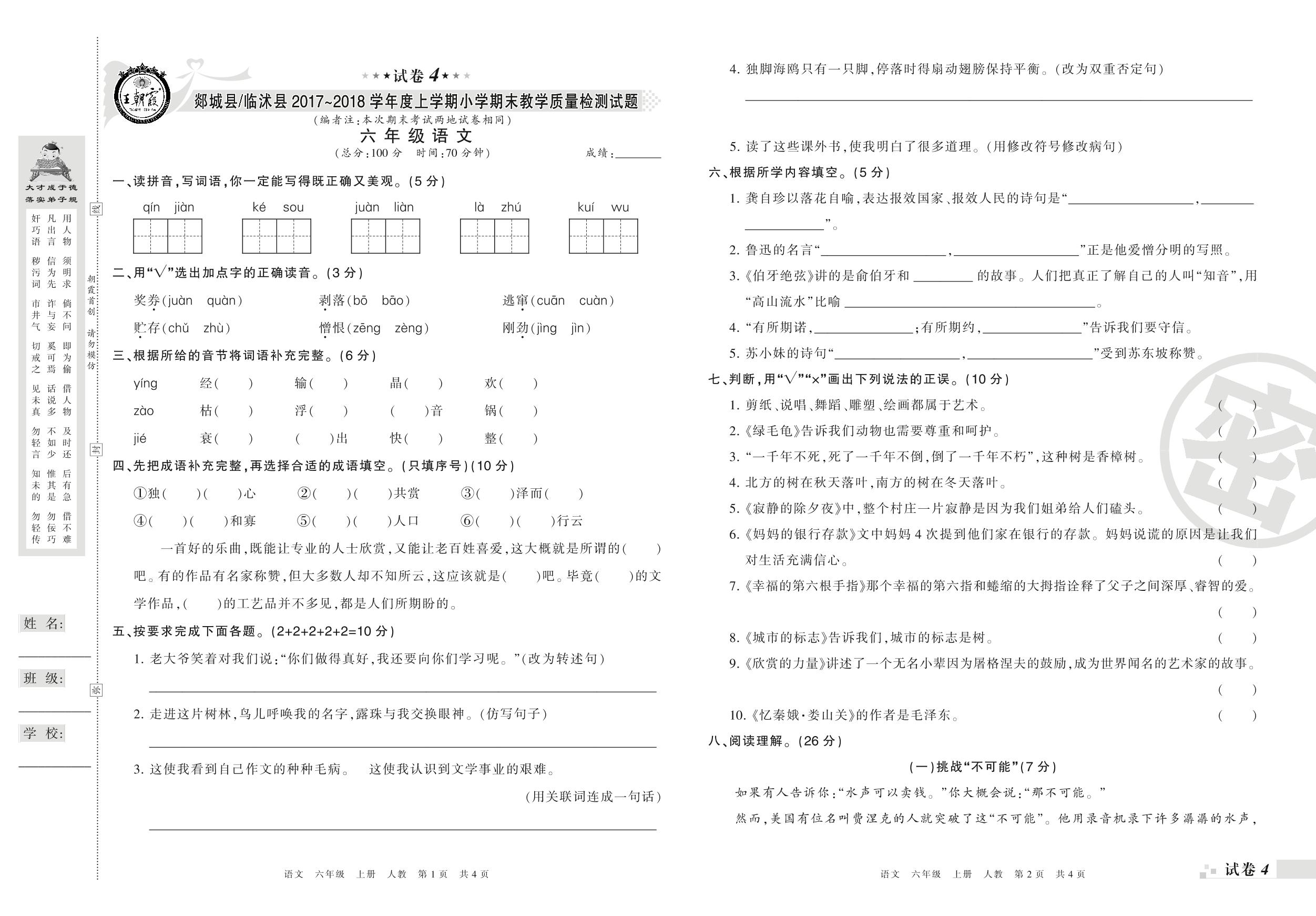 2017-2018学年第一学期临沂市郯城县、临沭县六年级语文试卷(人教版)【4】