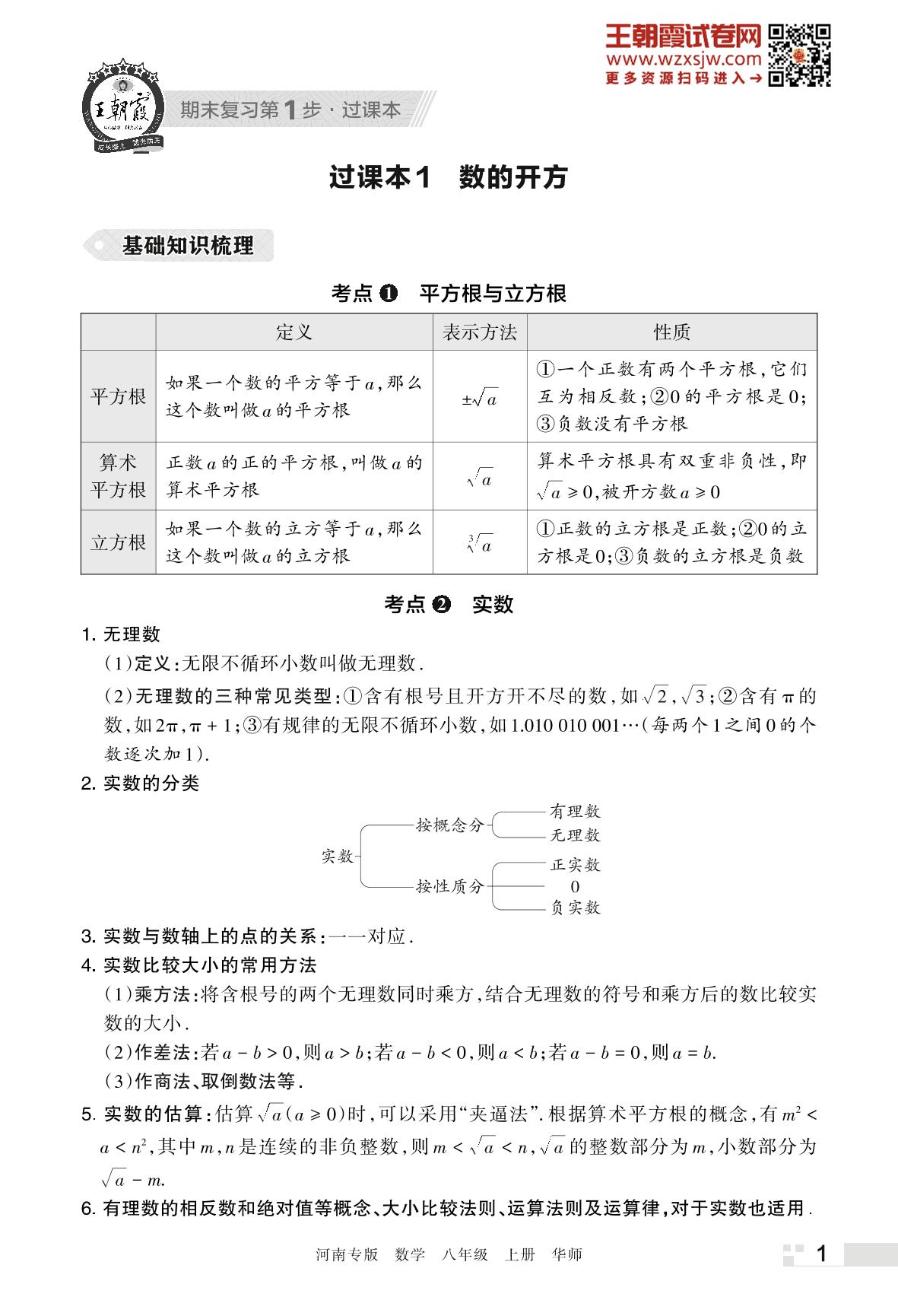 王朝霞期末过课本——1 数的开方八年级上册数学(华师版)