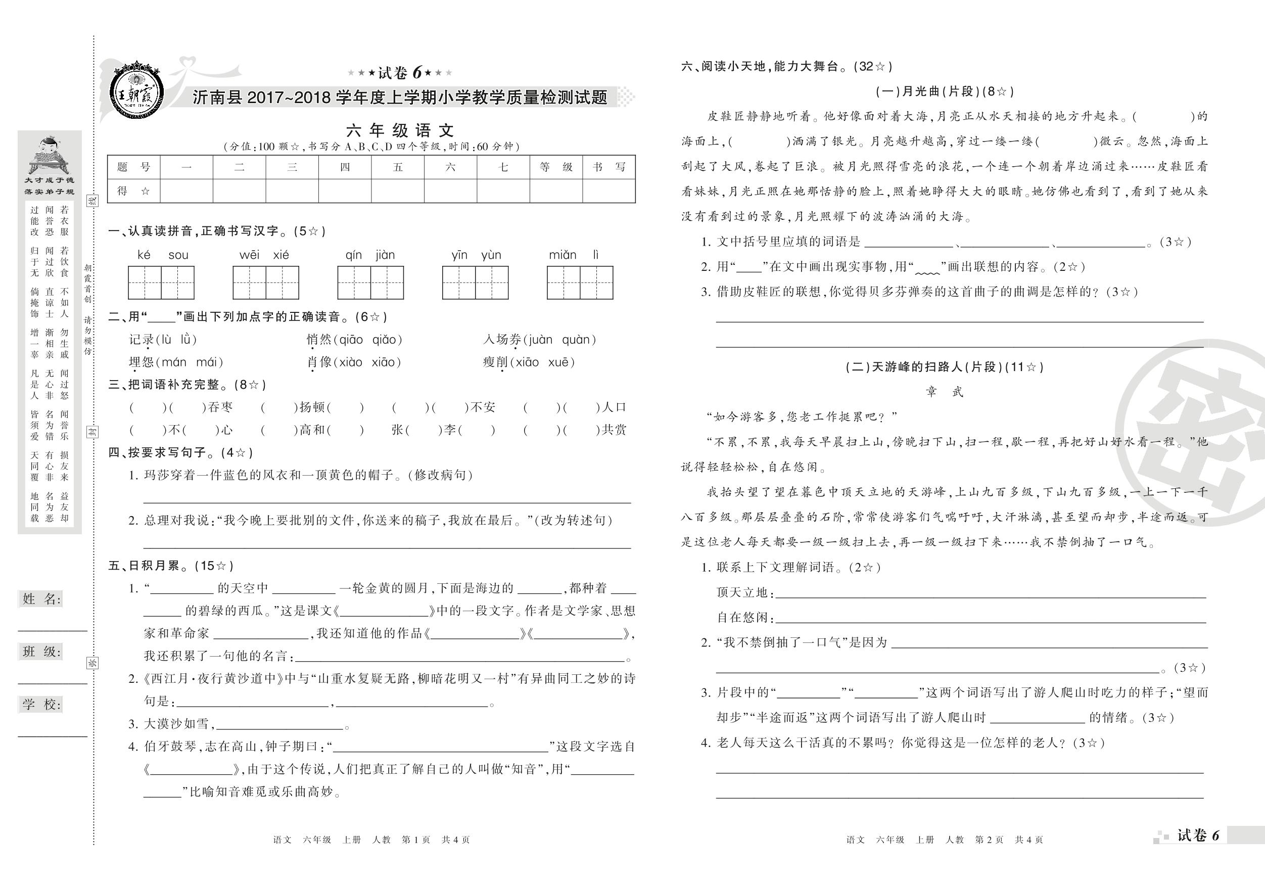2017-2018学年第一学期临沂市沂南县六年级语文试卷(人教版)【6】