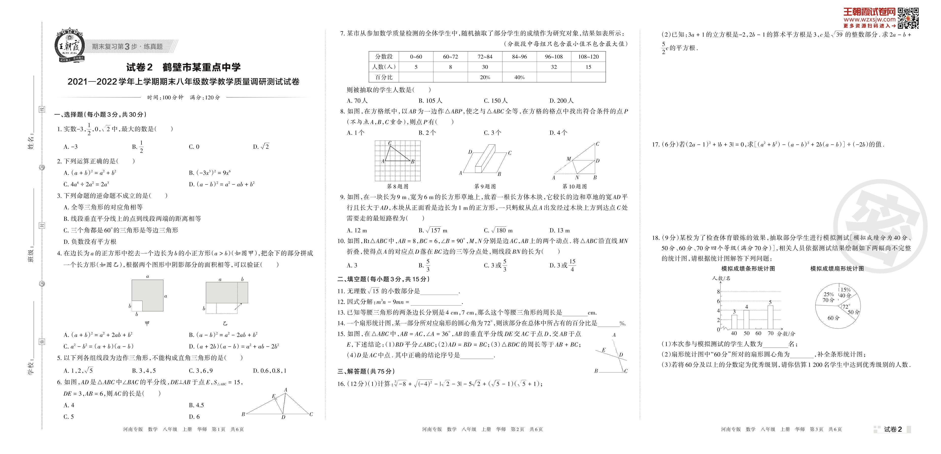 鹤壁市某重点中学2021—2022学年上学期期末八年级数学教学质量调研测试试卷(华师版)【2】