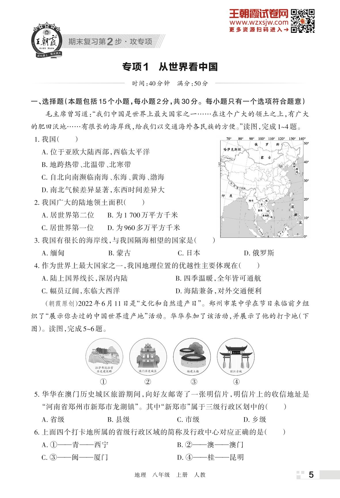 王朝霞期末专项卷——从世界看中国八年级上册地理(人教版)_R221114165503555【1】