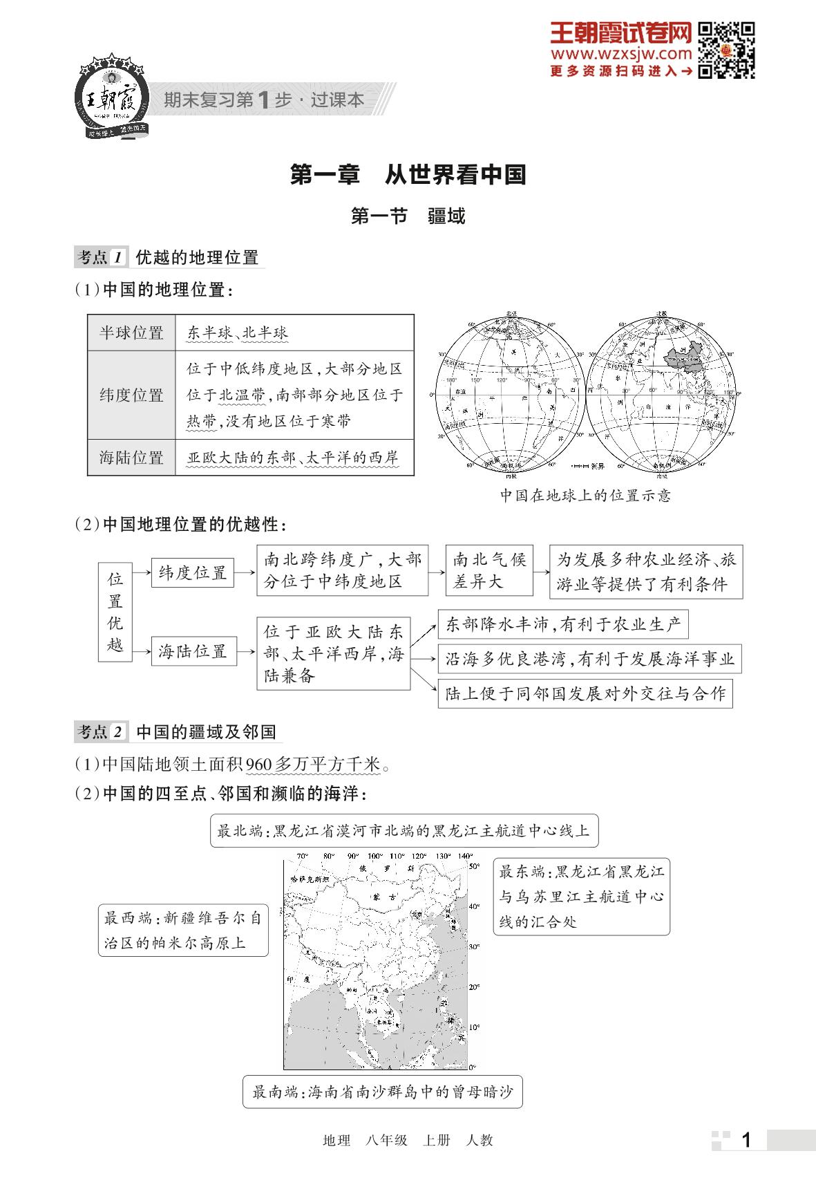 王朝霞期末过课本——第一章 从世界看中国八年级上册地理(人教版)