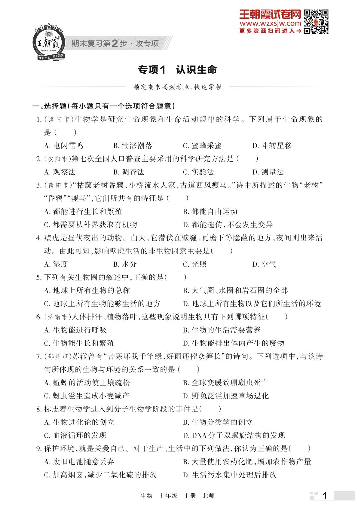 王朝霞期末专项卷——认识生命七年级上册生物(北师版)【1】
