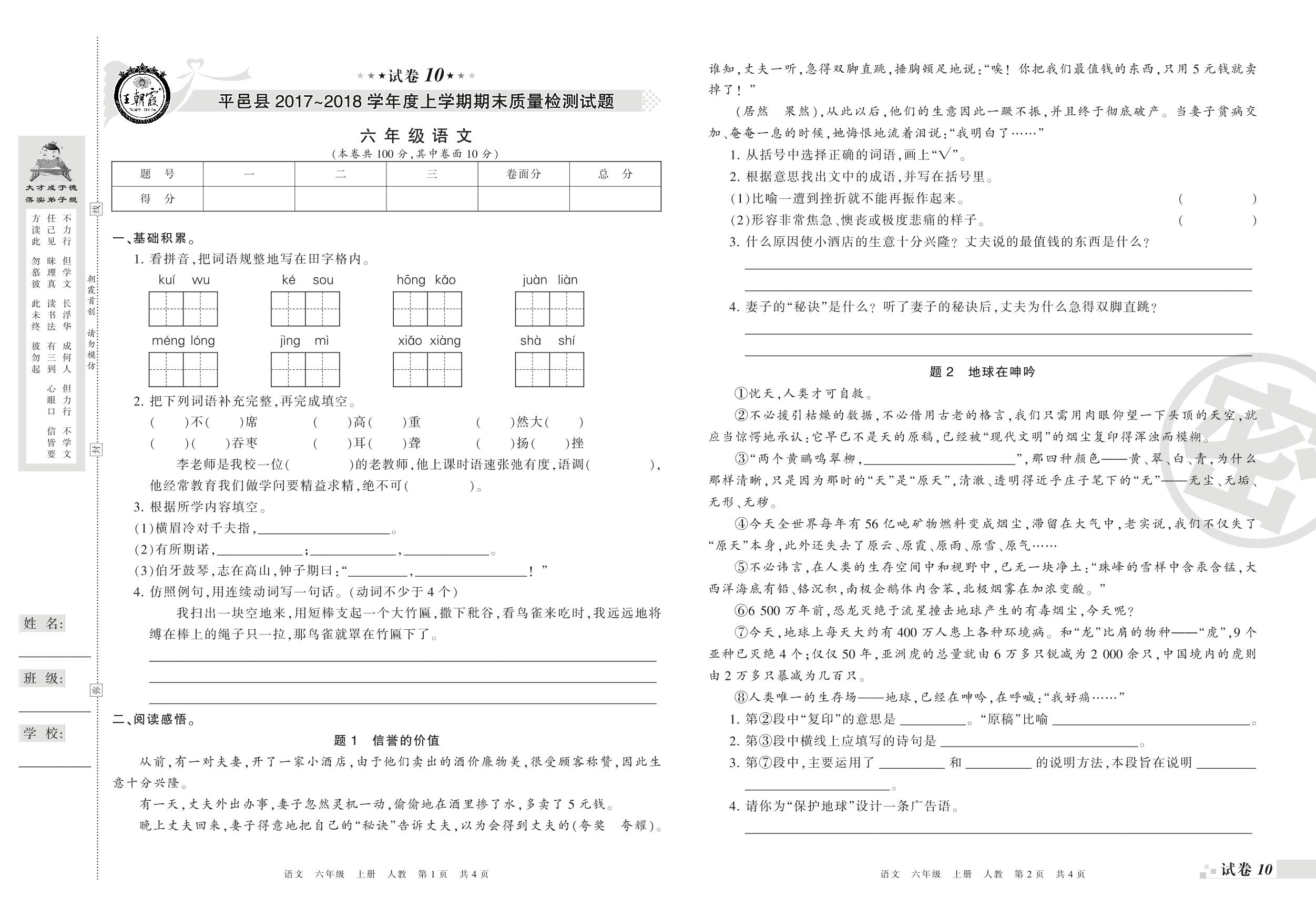 2017-2018学年第一学期临沂市平邑县六年级语文试卷(人教版)【10】