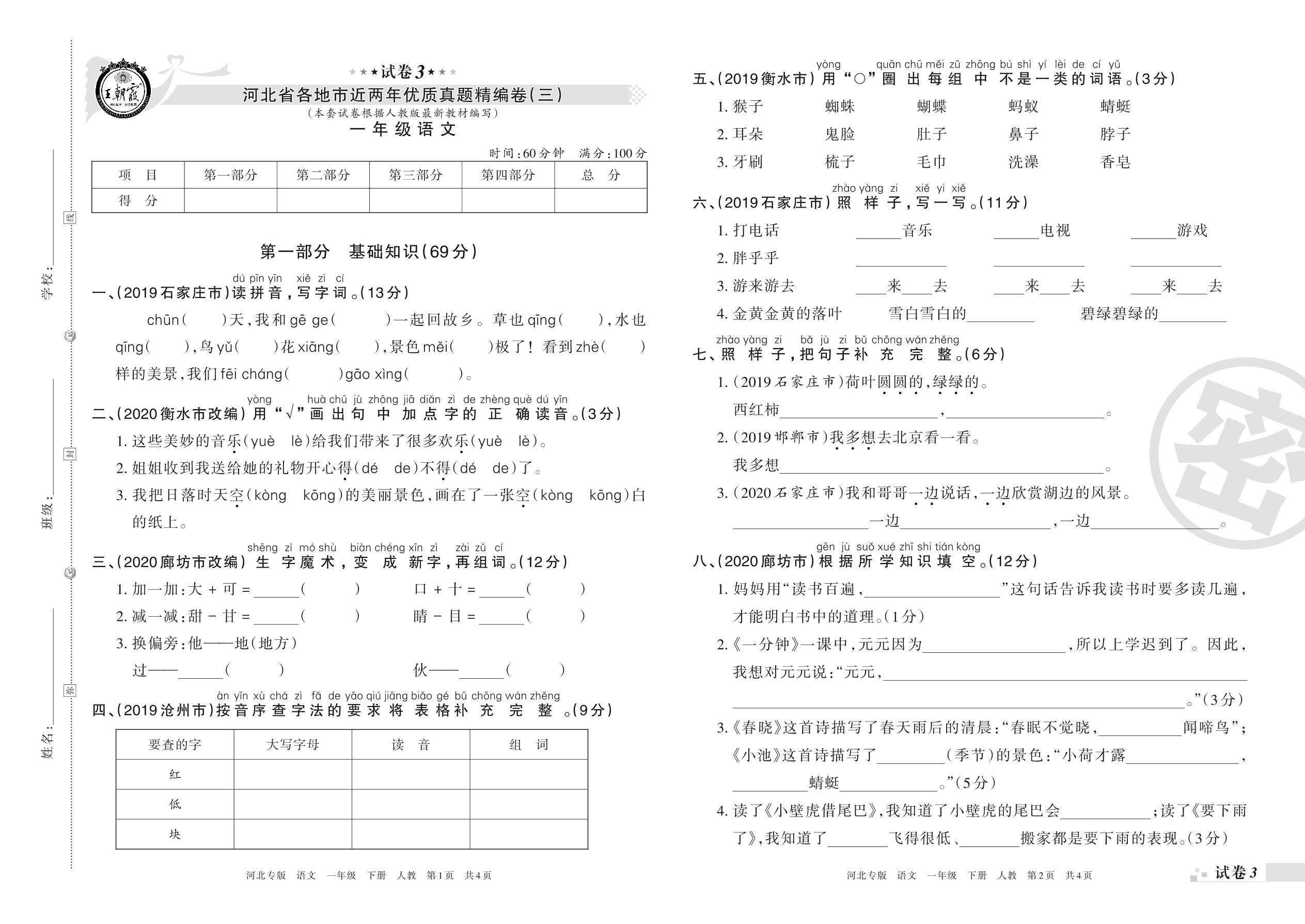 河北省各地市近两年优质真题精编卷(三)一年级下册语文(人教版)【3】