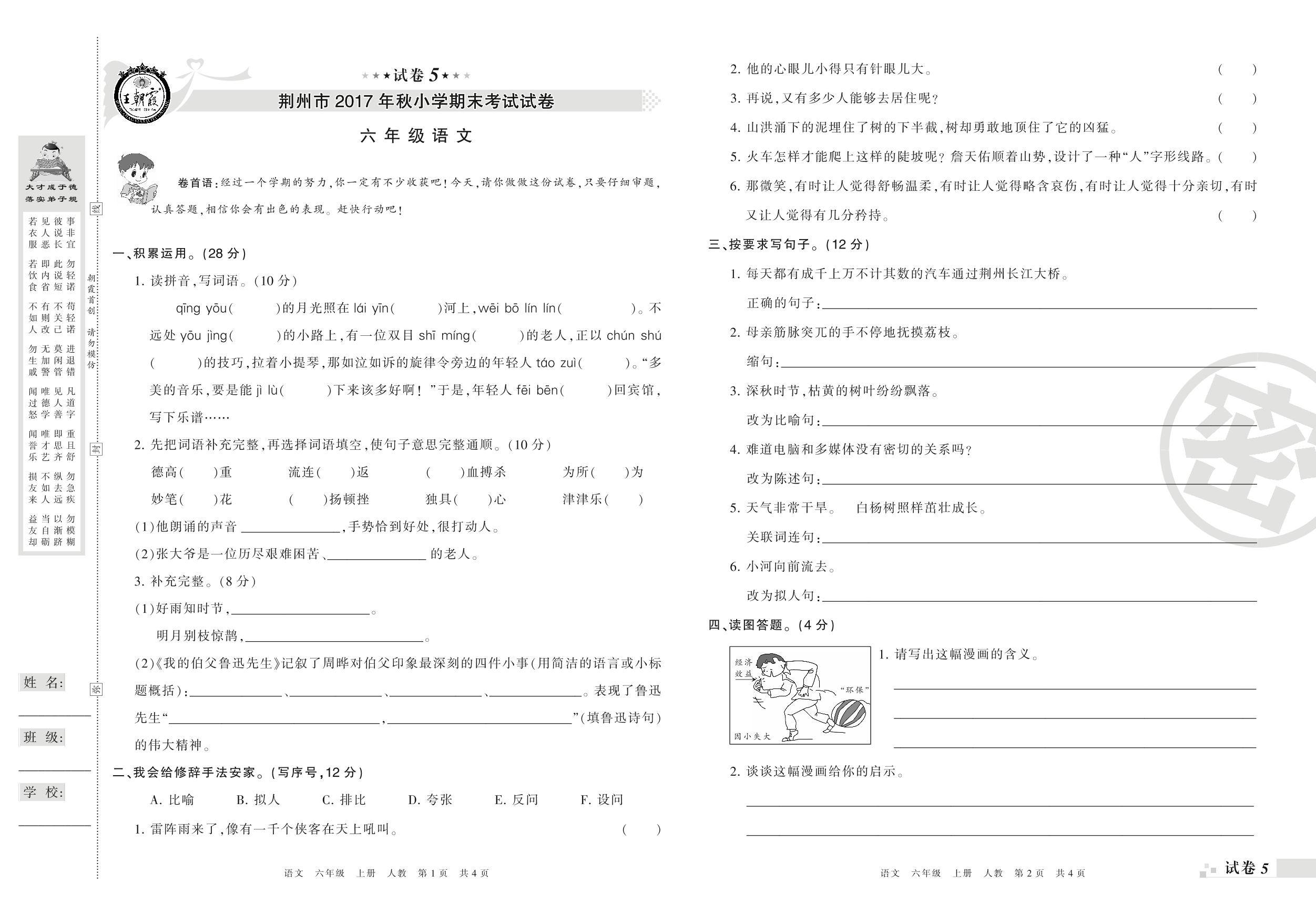 2017-2018学年第一学期荆州市六年级语文试卷(人教版)【5】