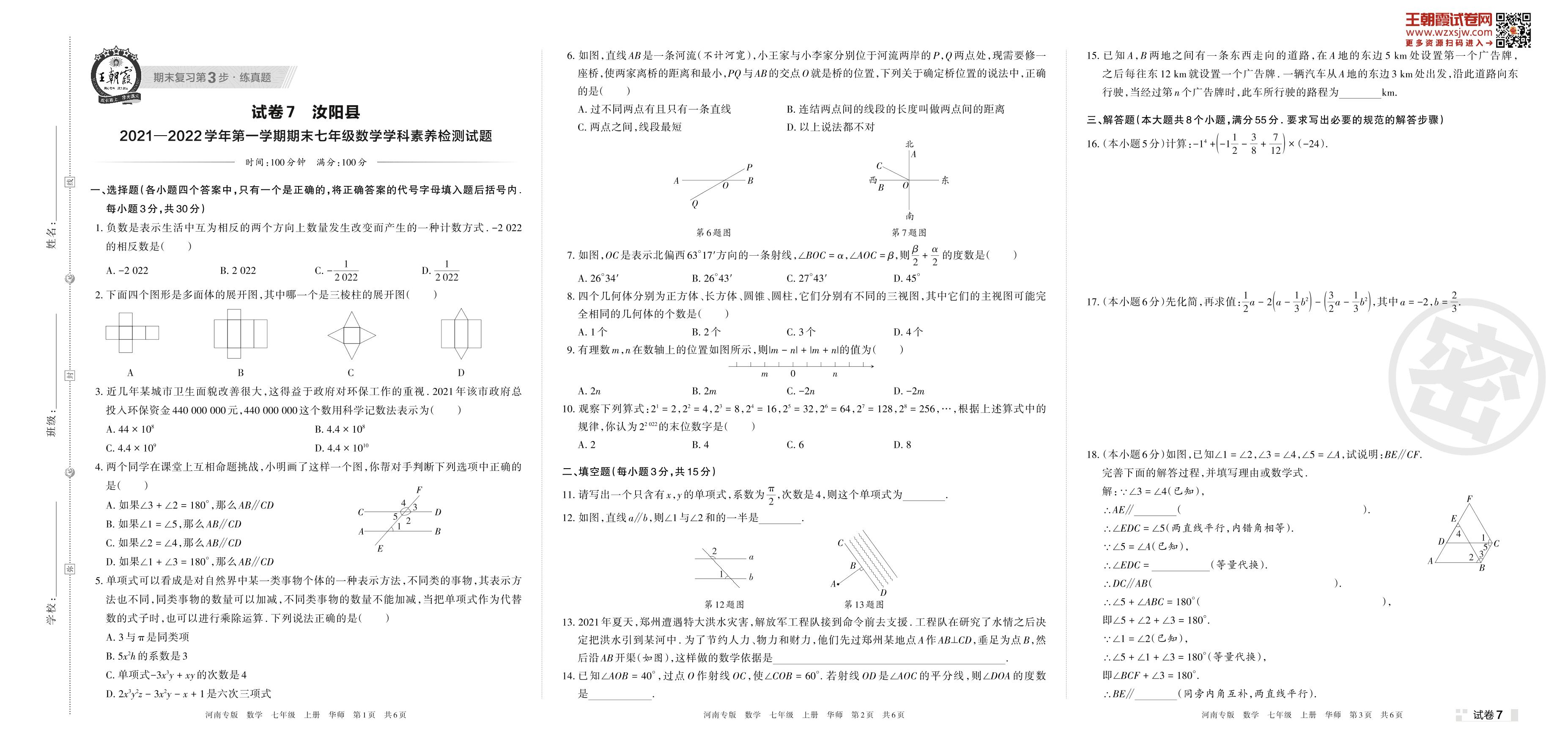 汝阳县2021—2022学年第一学期期末七年级数学学科素养检测试题(华师版)【7】