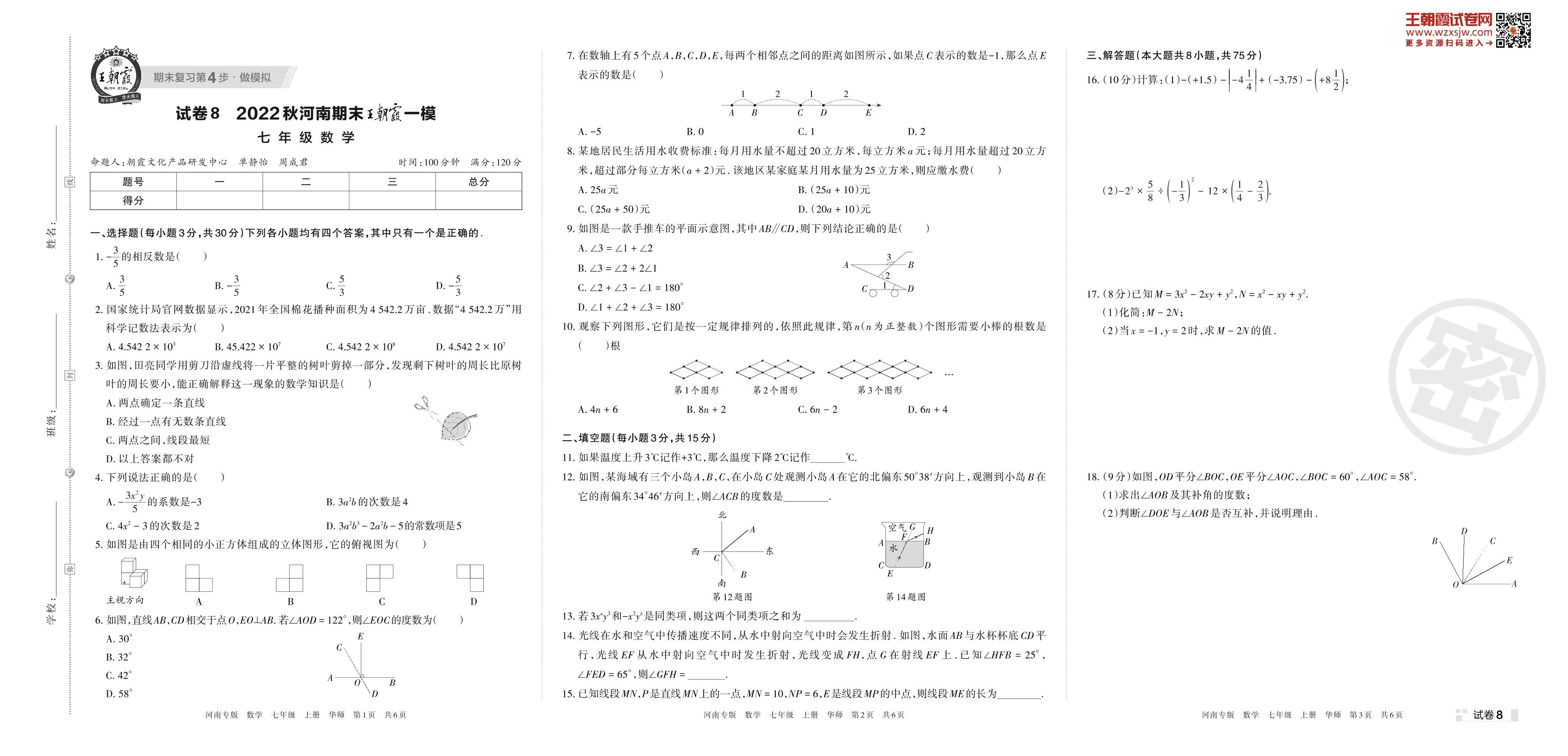 王朝霞期末模拟卷七年级上册数学(华师版)【8】