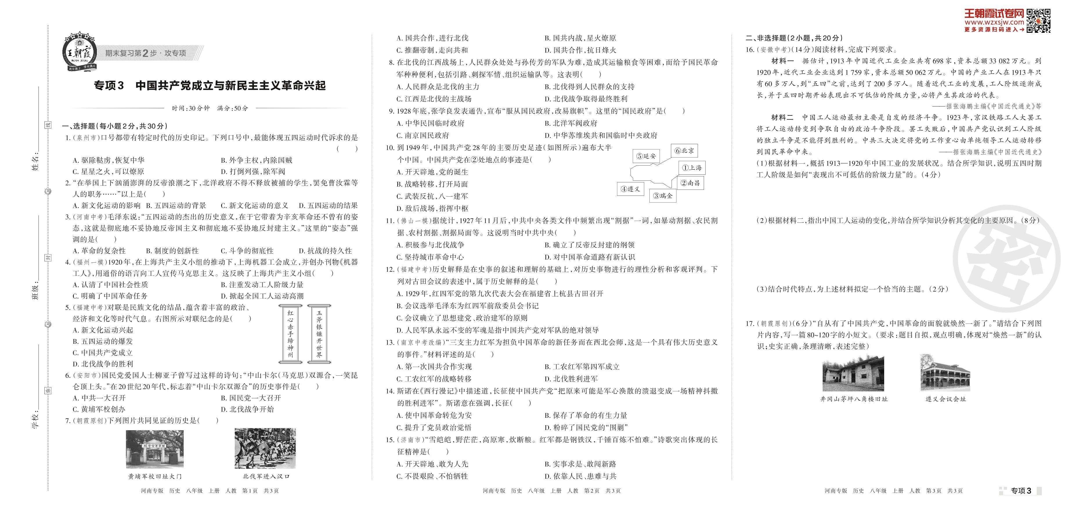 王朝霞期末专项卷——中国共产党成立与新民主主义革命兴起八年级上册历史(人教版)【3】