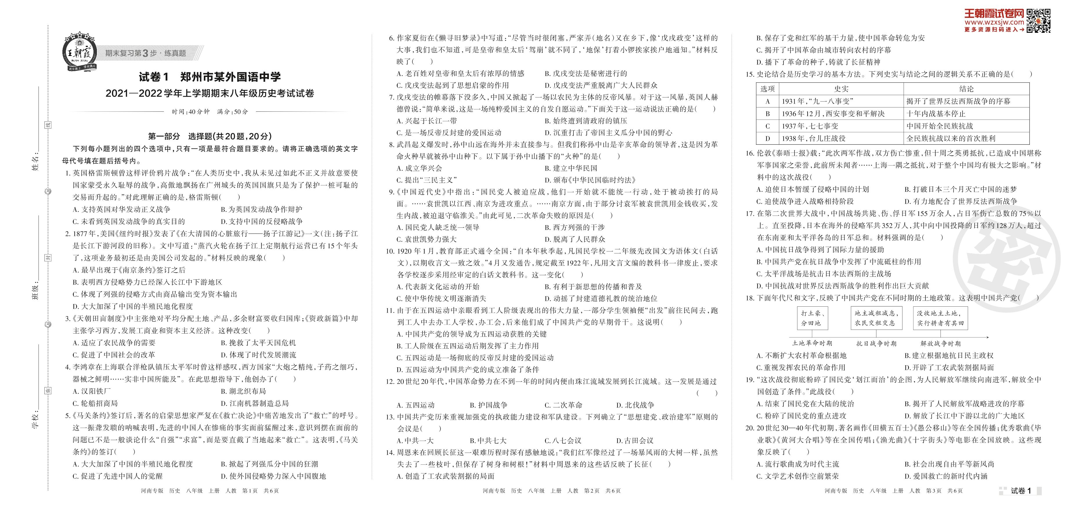 郑州市某外国语中学2021—2022学年上学期期末八年级历史考试试卷(人教版)【1】