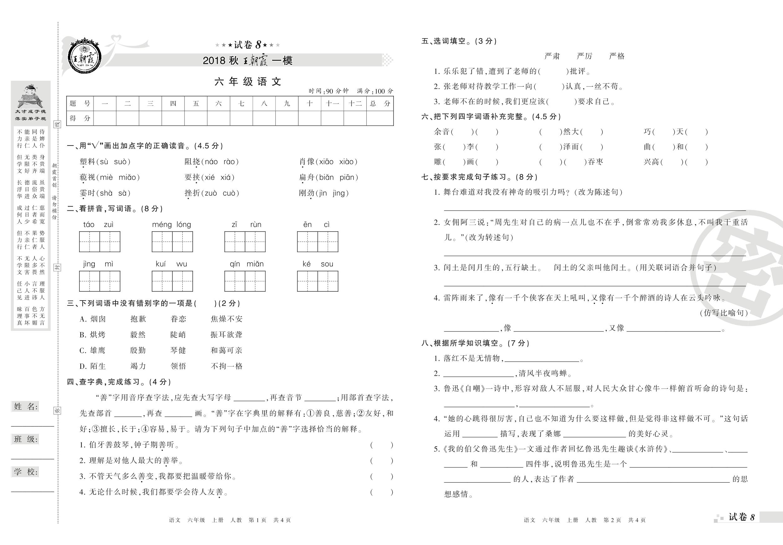 王朝霞期末模拟卷六年级上册语文(人教版)_R210802114042【8】