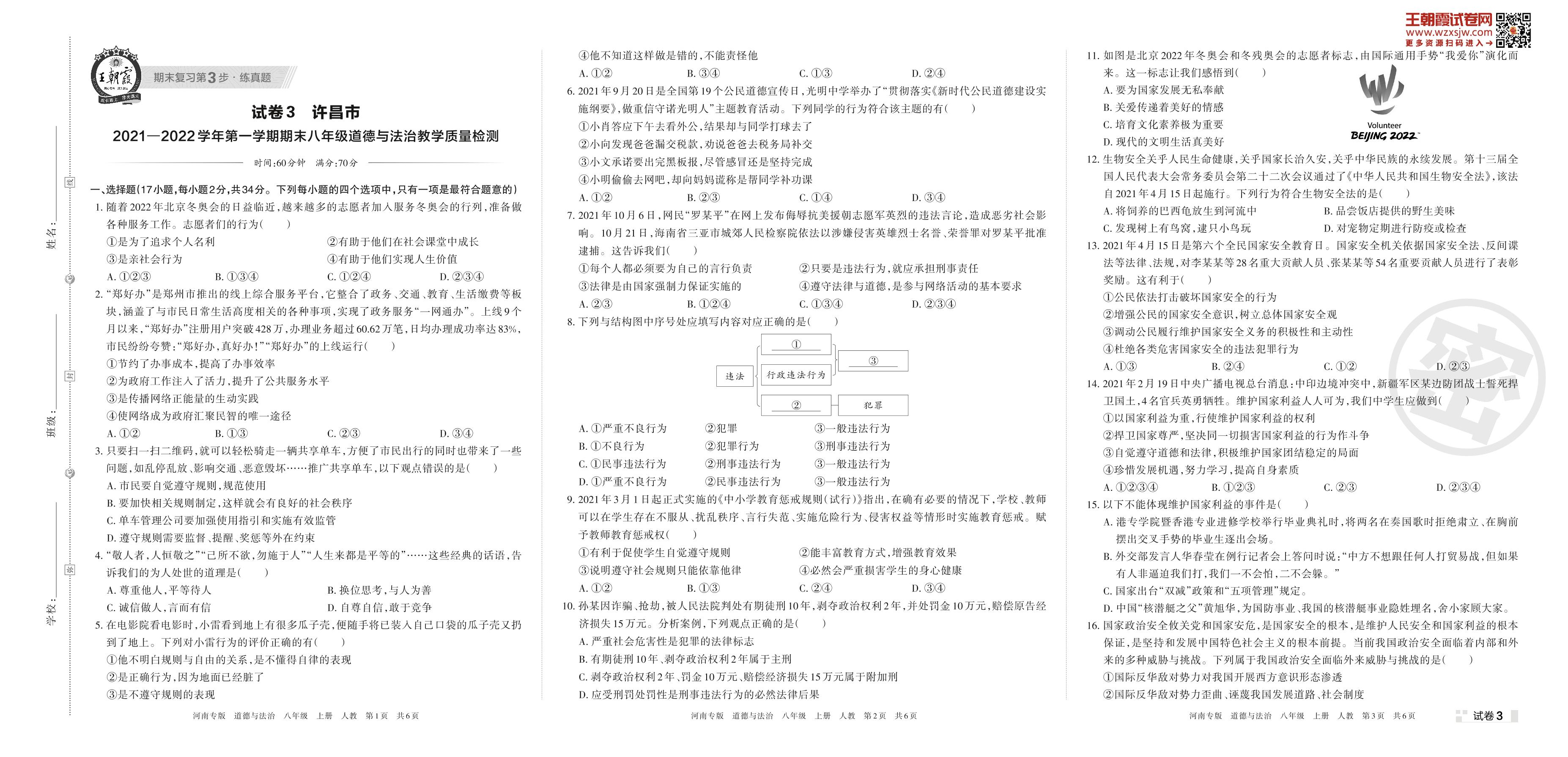 许昌市2021—2022学年第一学期期末八年级道德与法治教学质量检测(人教版)【3】