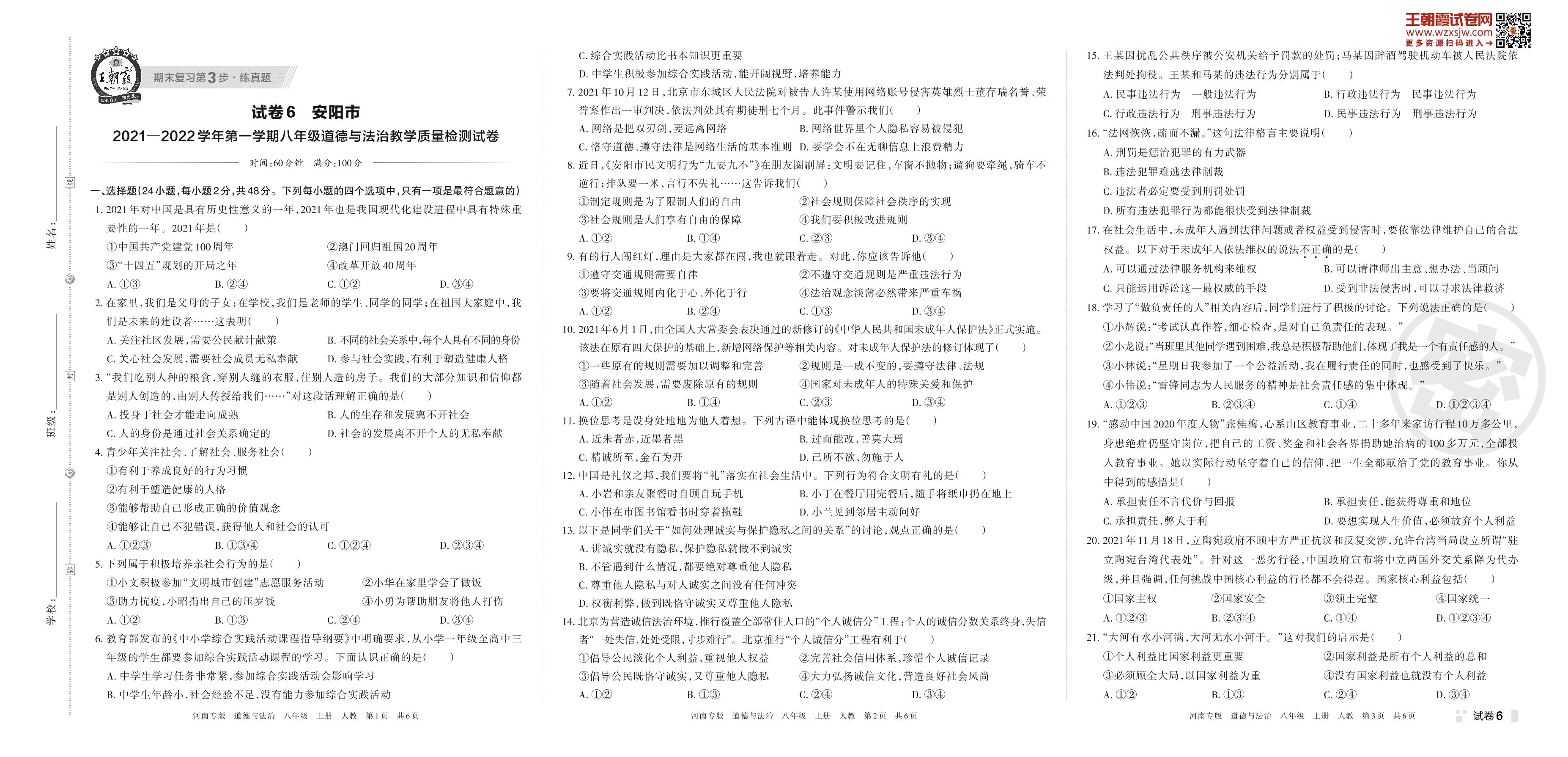 安阳市2021—2022学年第一学期八年级道德与法治教学质量检测试卷(人教版)【6】