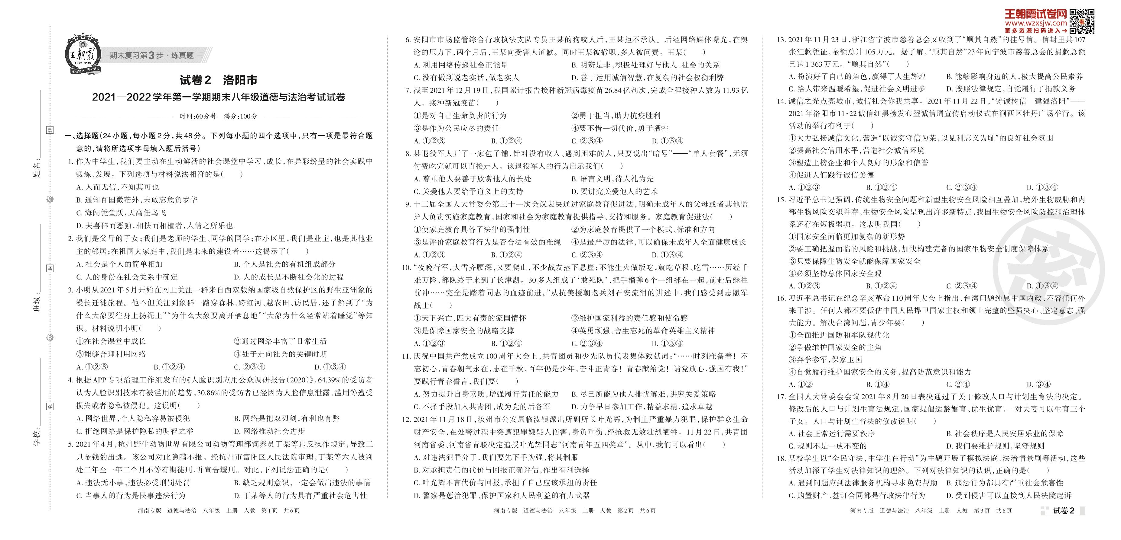 洛阳市2021—2022学年第一学期期末八年级道德与法治考试试卷(人教版)【2】