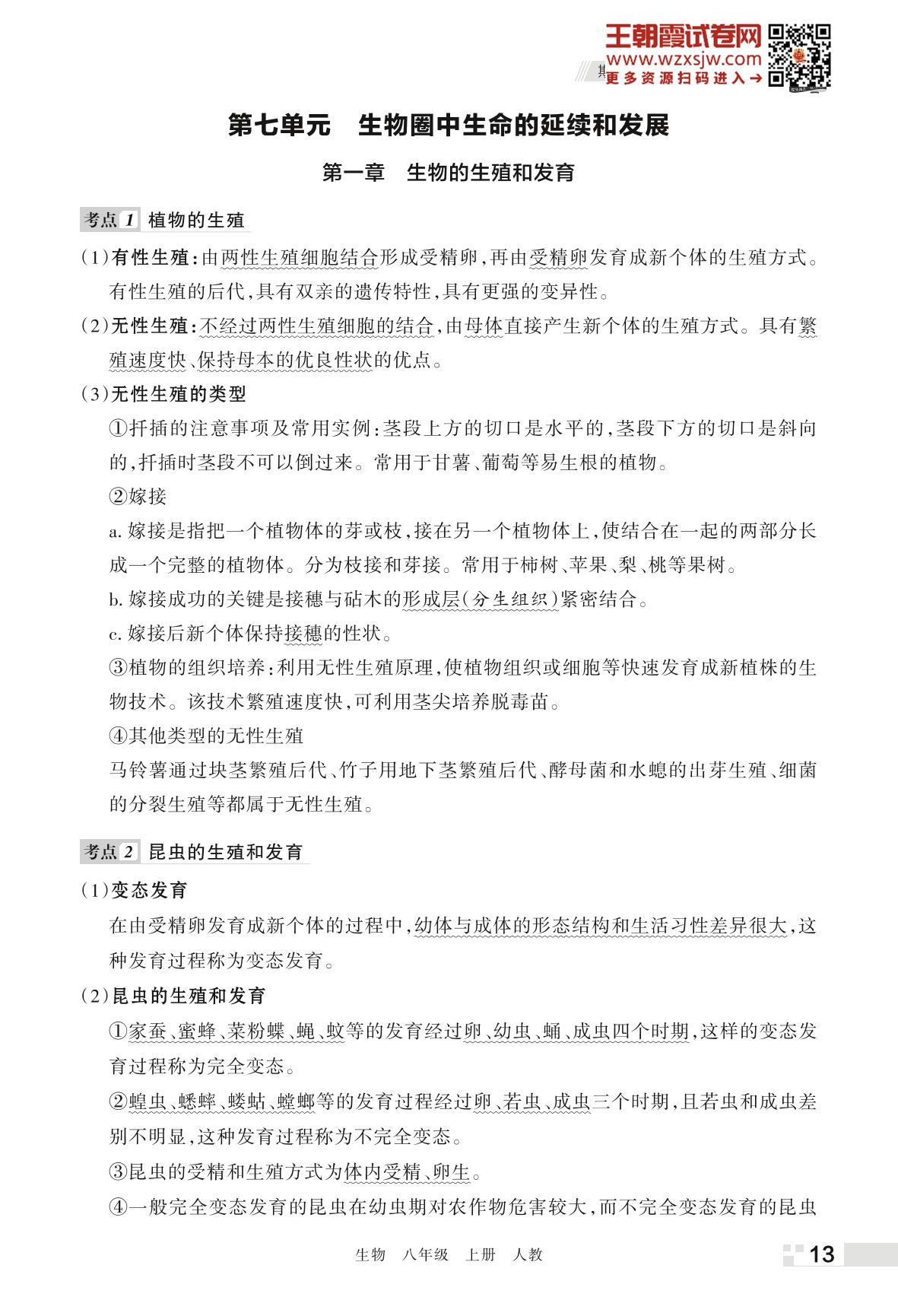 王朝霞期末过课本——第七单元 生物圈中生命的延续和发展八年级上册生物(人教版)
