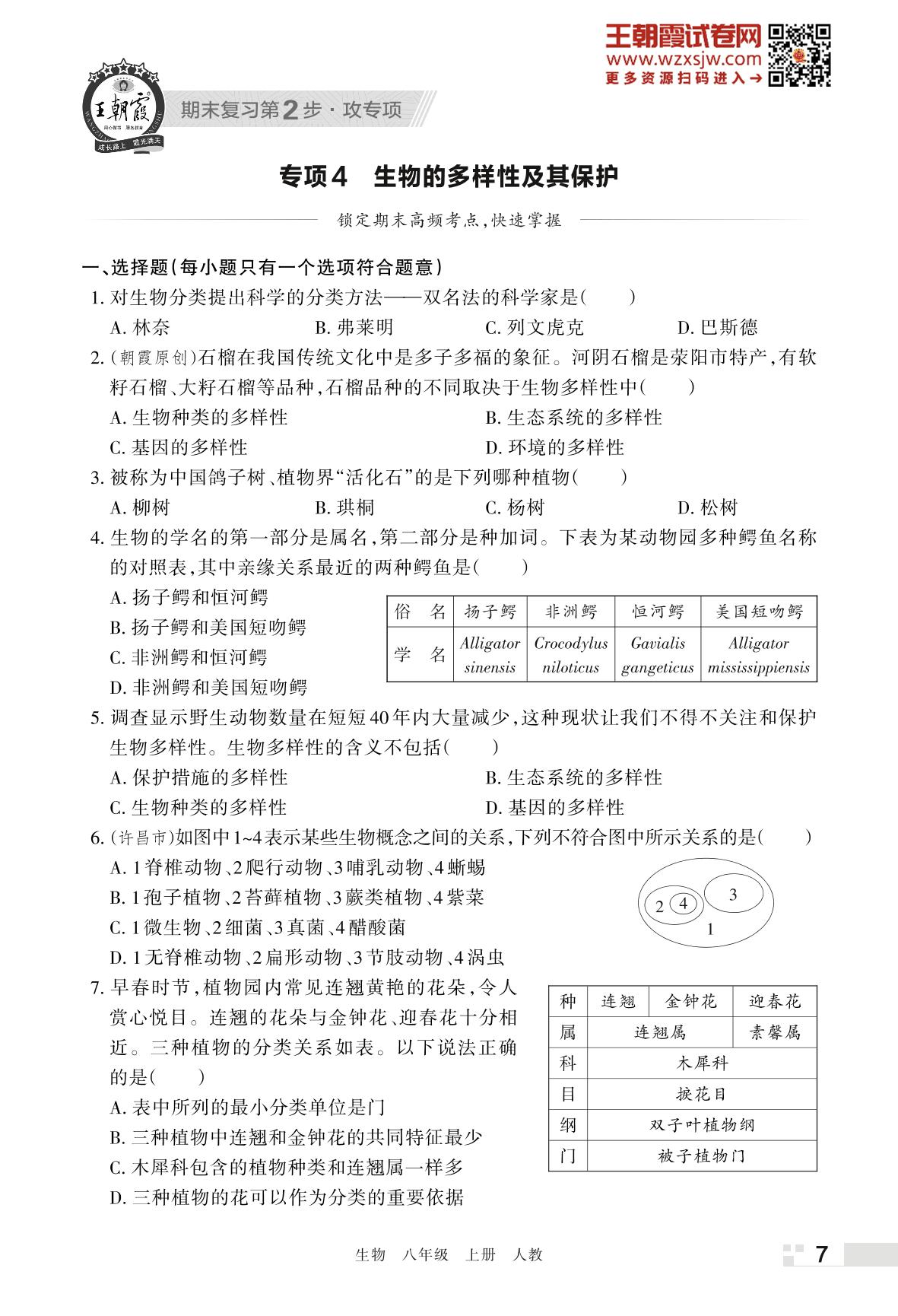 王朝霞期末专项卷——生物的多样性及其保护八年级上册生物(人教版)【4】