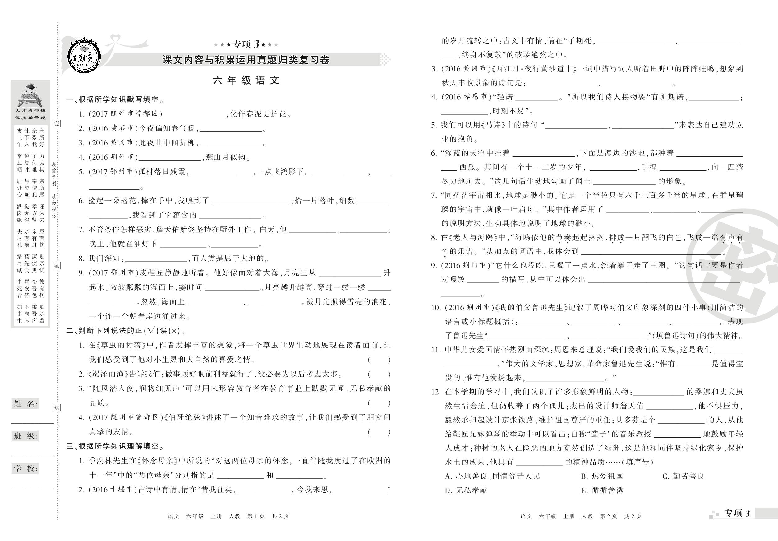 王朝霞期末专项卷——课文内容与积累运用、课内阅读与写作真题归类复习卷六年级上册语文(人教版)_R210802114056【0】