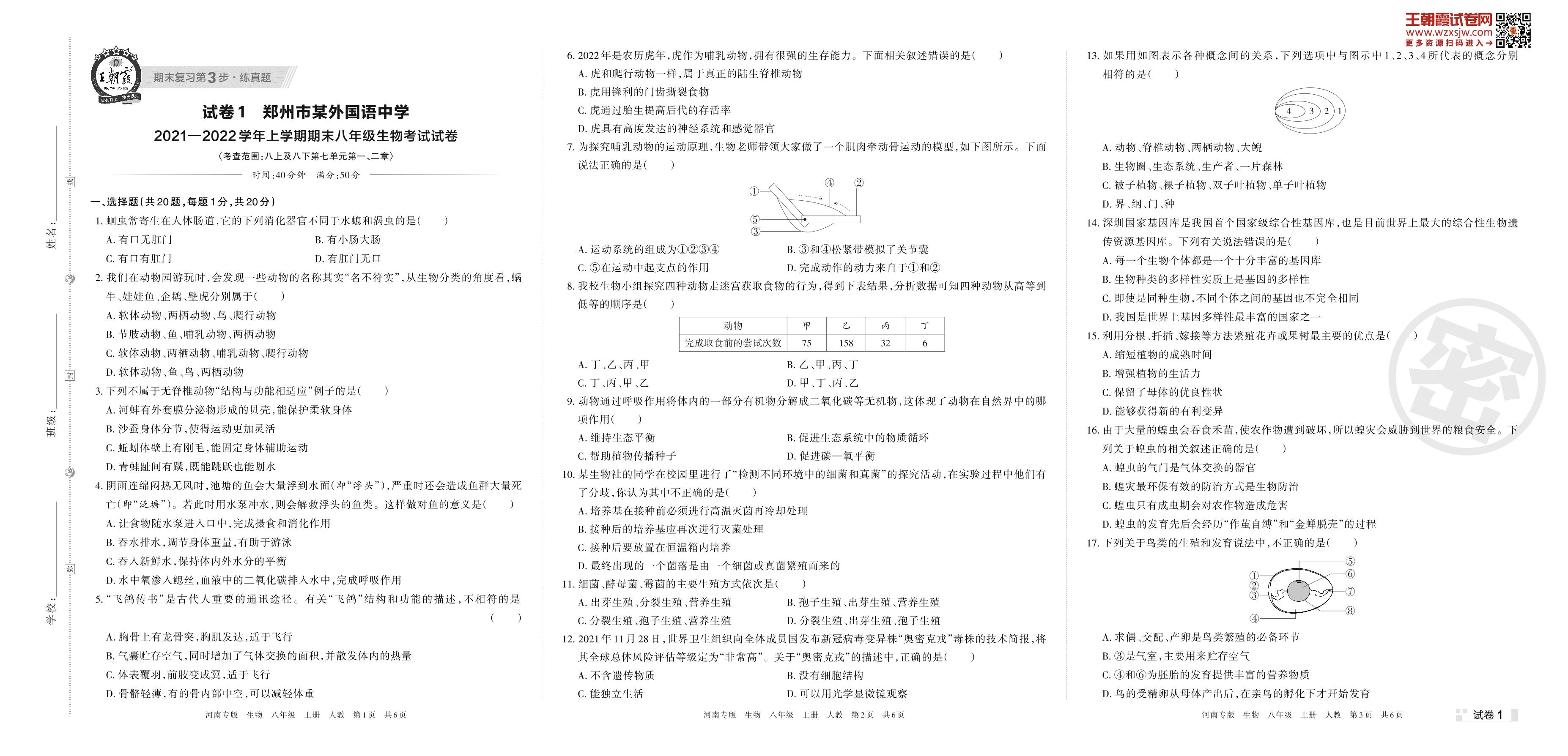 郑州市某外国语中学2021—2022学年上学期期末八年级生物考试试卷(人教版)【1】