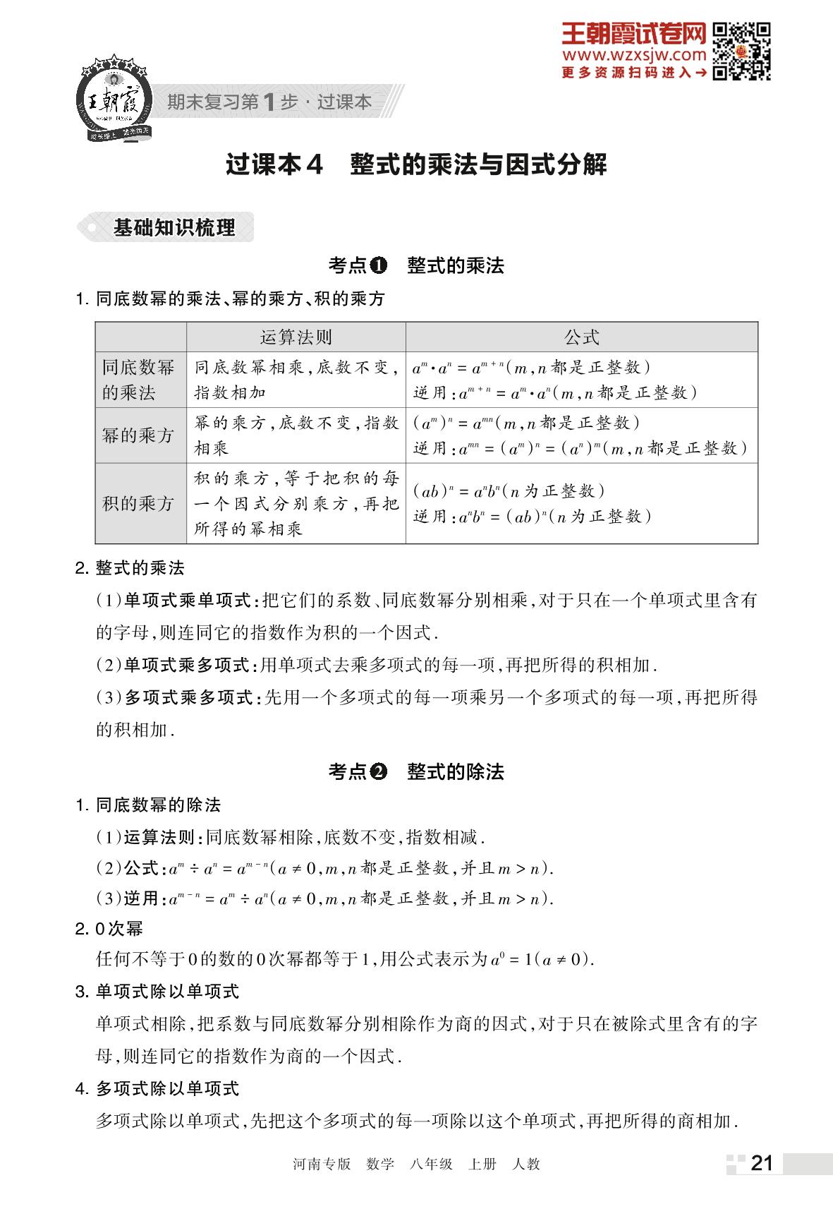 王朝霞期末过课本——4 整式的乘法与因式分解八年级上册数学(人教版)