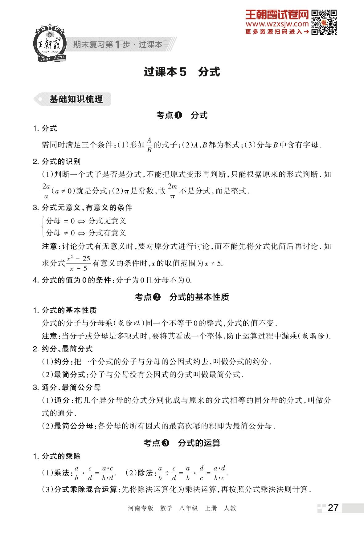 王朝霞期末过课本——5 分式八年级上册数学(人教版)