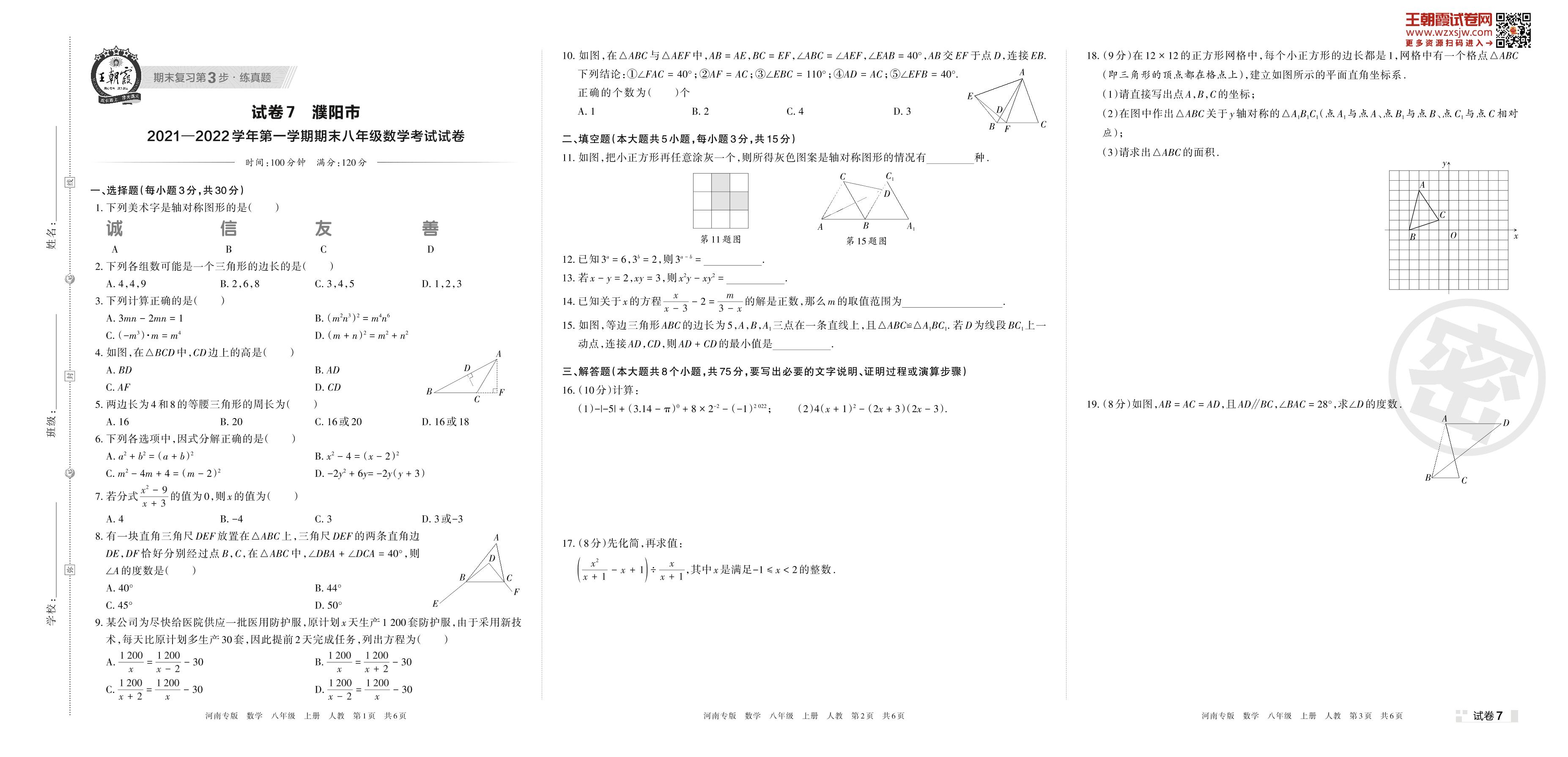 濮阳市2021—2022学年第一学期期末八年级数学考试试卷 (人教版)【7】