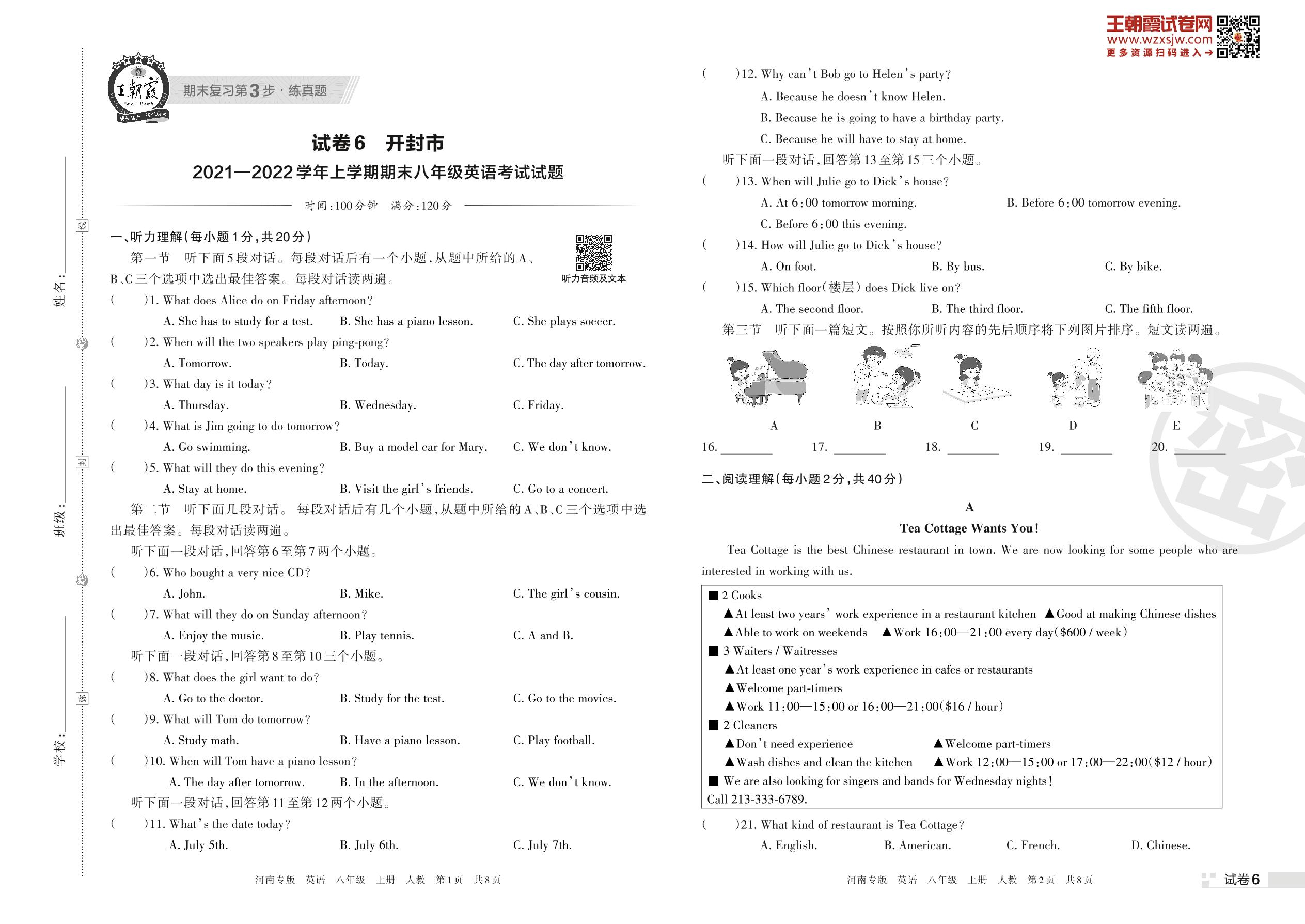 开封市2021—2022学年上学期期末八年级英语考试试题(人教版)【6】