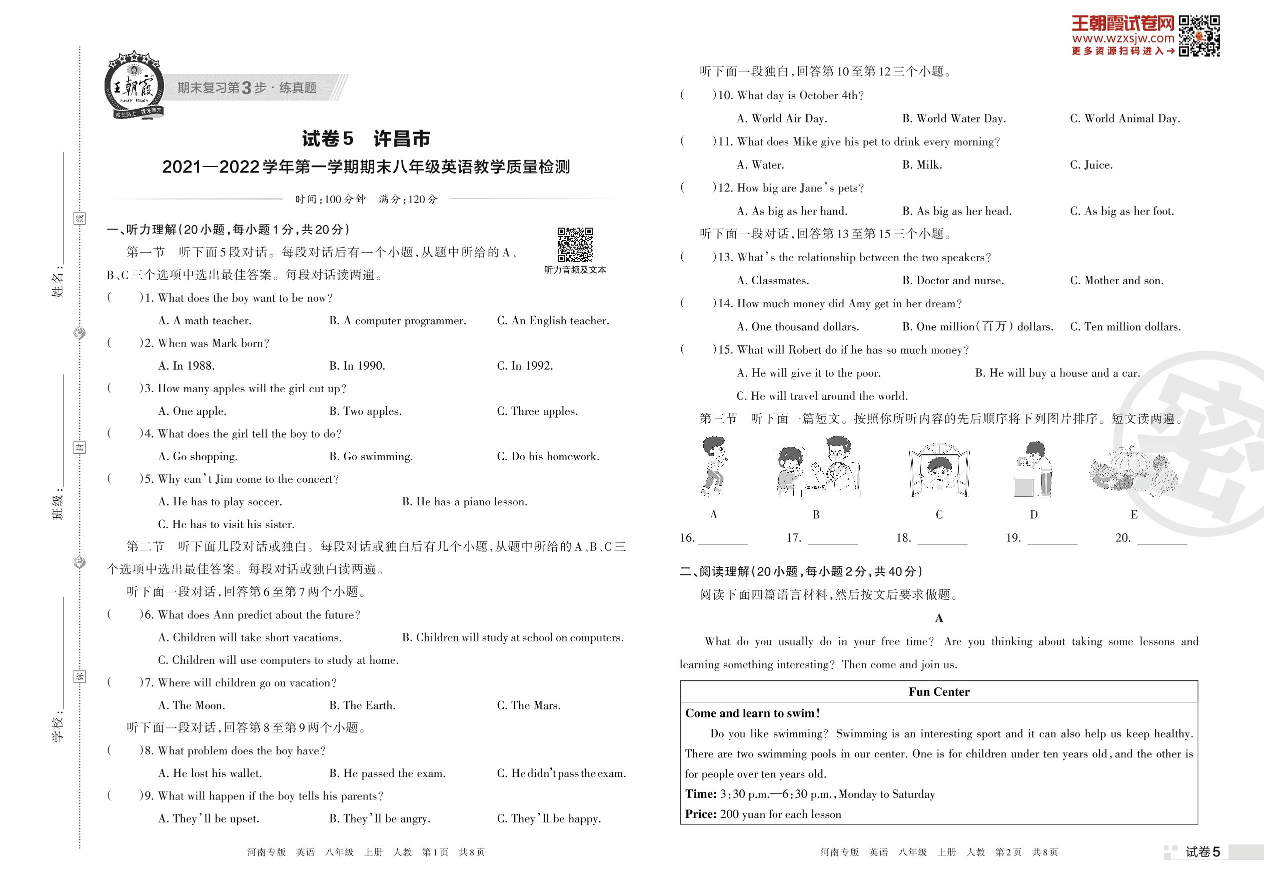 许昌市2021—2022学年第一学期期末八年级英语教学质量检测(人教版)【5】