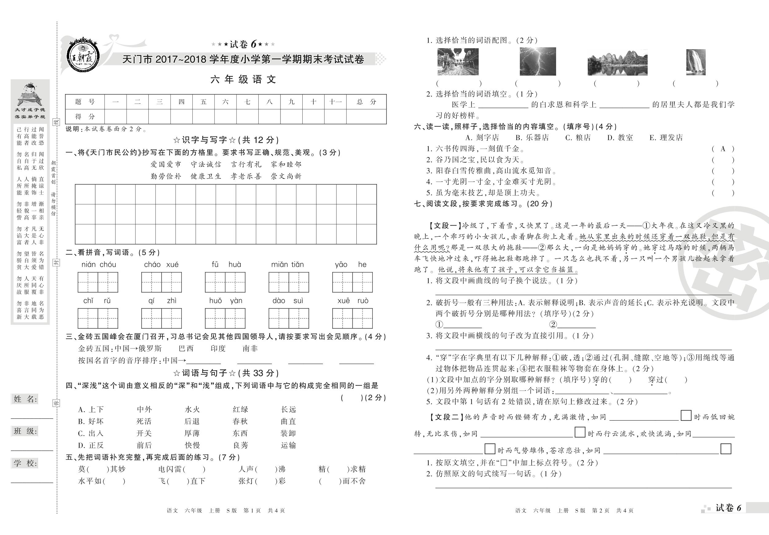 2017-2018学年第一学期天门市六年级语文试卷(S版)【6】