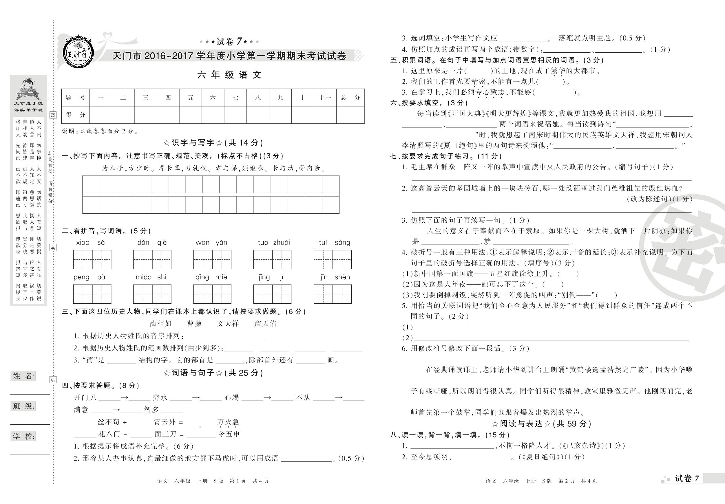 2016-2017学年第一学期天门市六年级语文试卷(S版)【7】