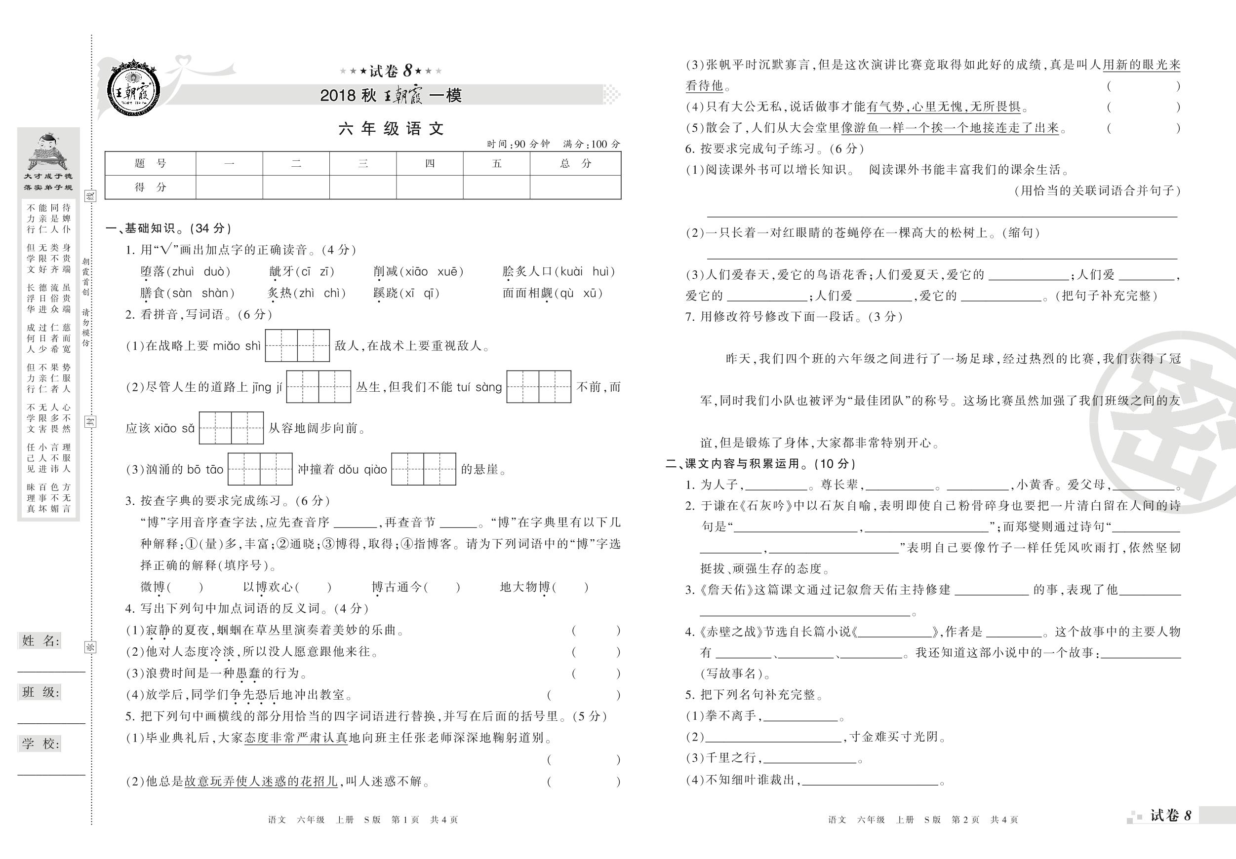 王朝霞期末模拟卷六年级上册语文(S版)【8】
