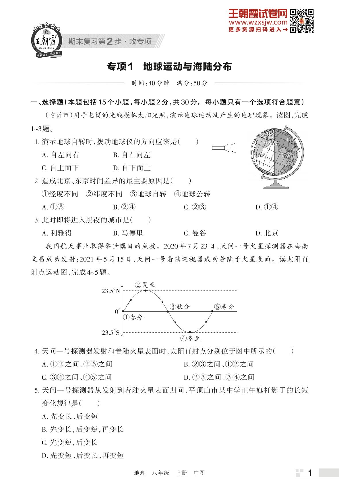 王朝霞期末专项卷——地球运动与海陆分布八年级上册地理(中图版)_R221115172617836【1】