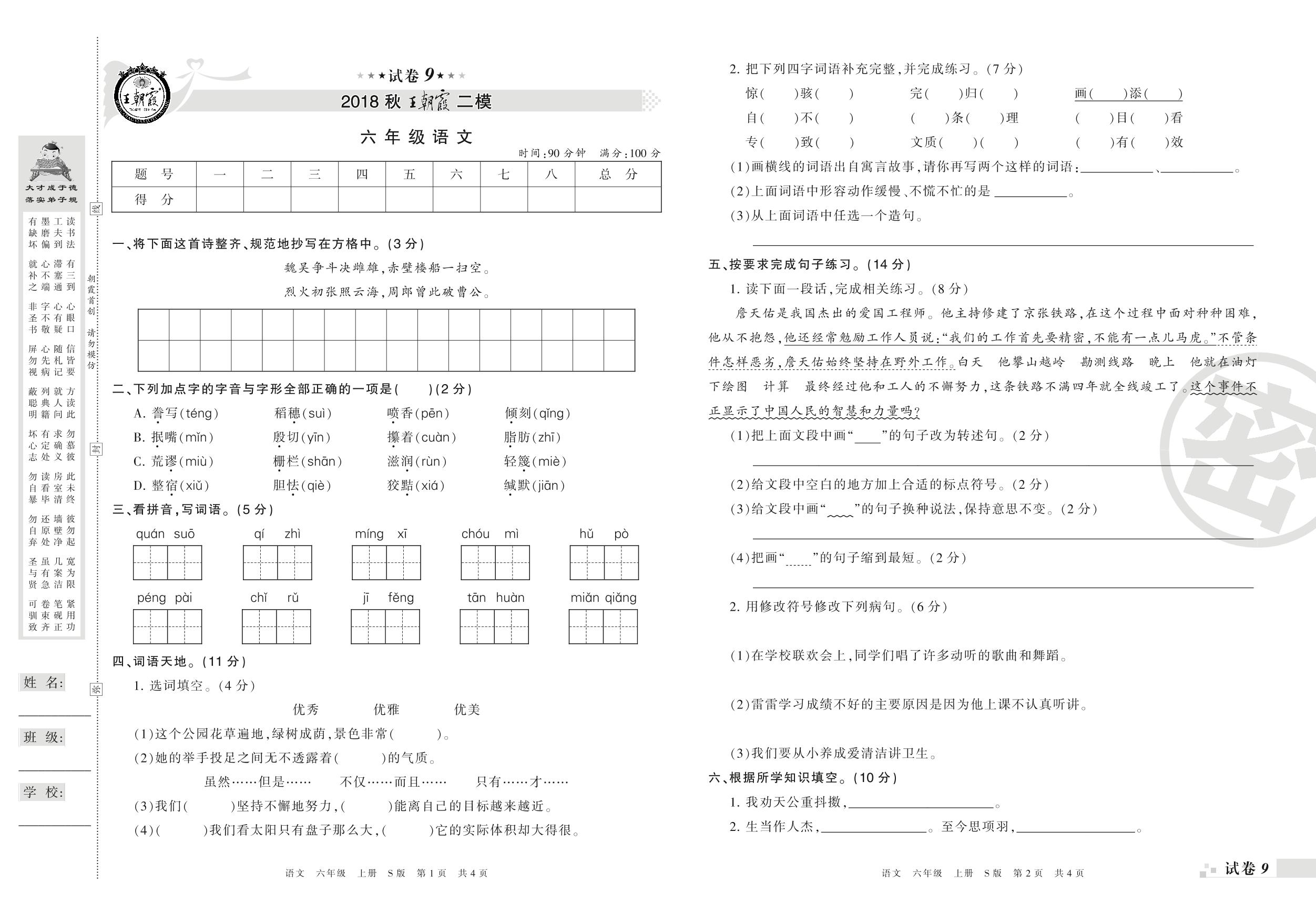 王朝霞期末模拟卷六年级上册语文(S版)_R210802114138【9】