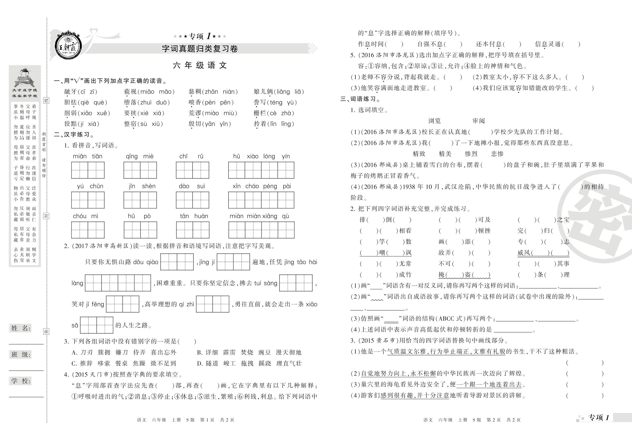 王朝霞期末专项卷——字词、句子真题归类复习卷六年级上册语文(S版)_R210802114142【0】