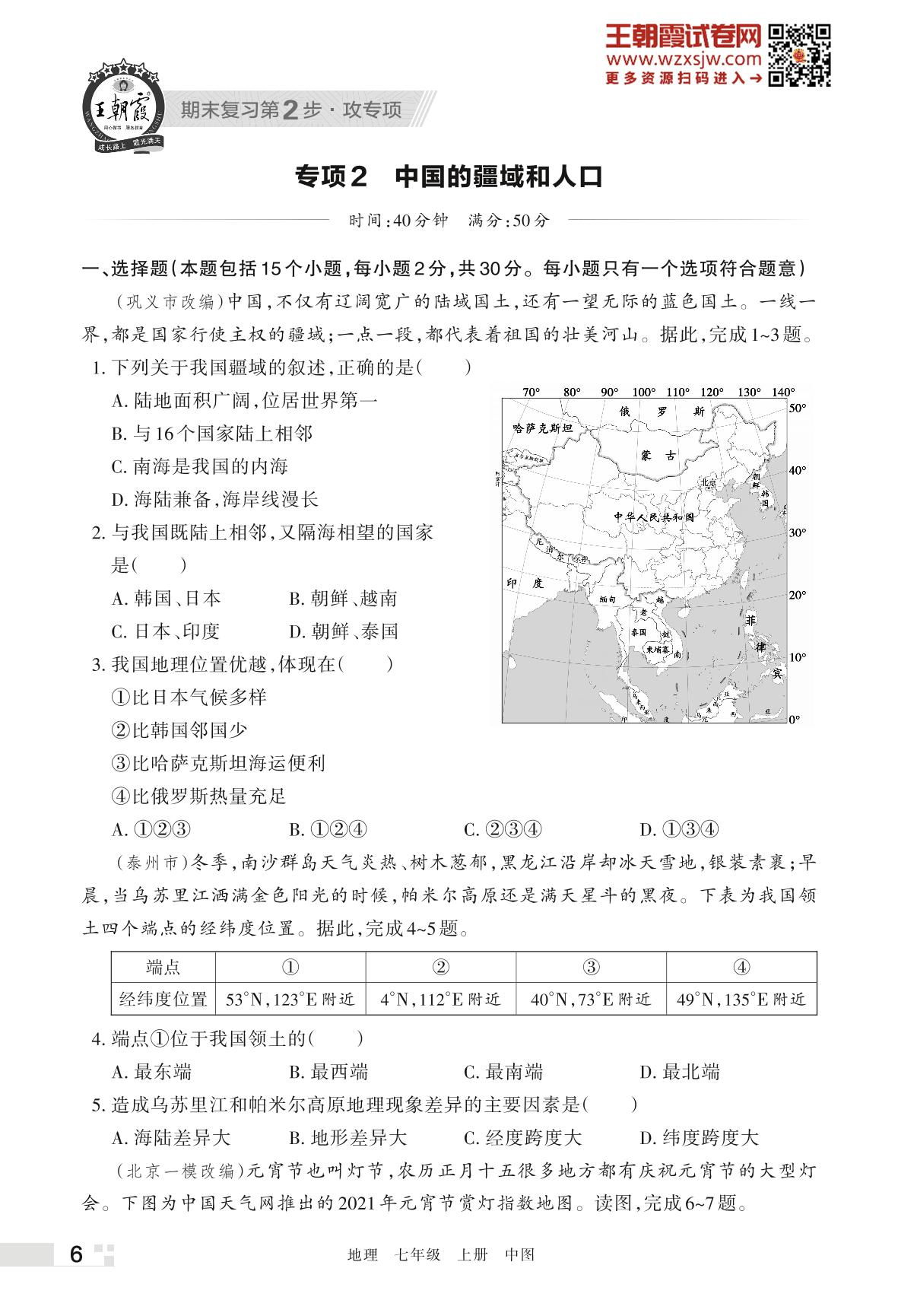 王朝霞期末专项卷——中国的疆域和人口七年级上册地理(中图版)_R221115173704273【2】