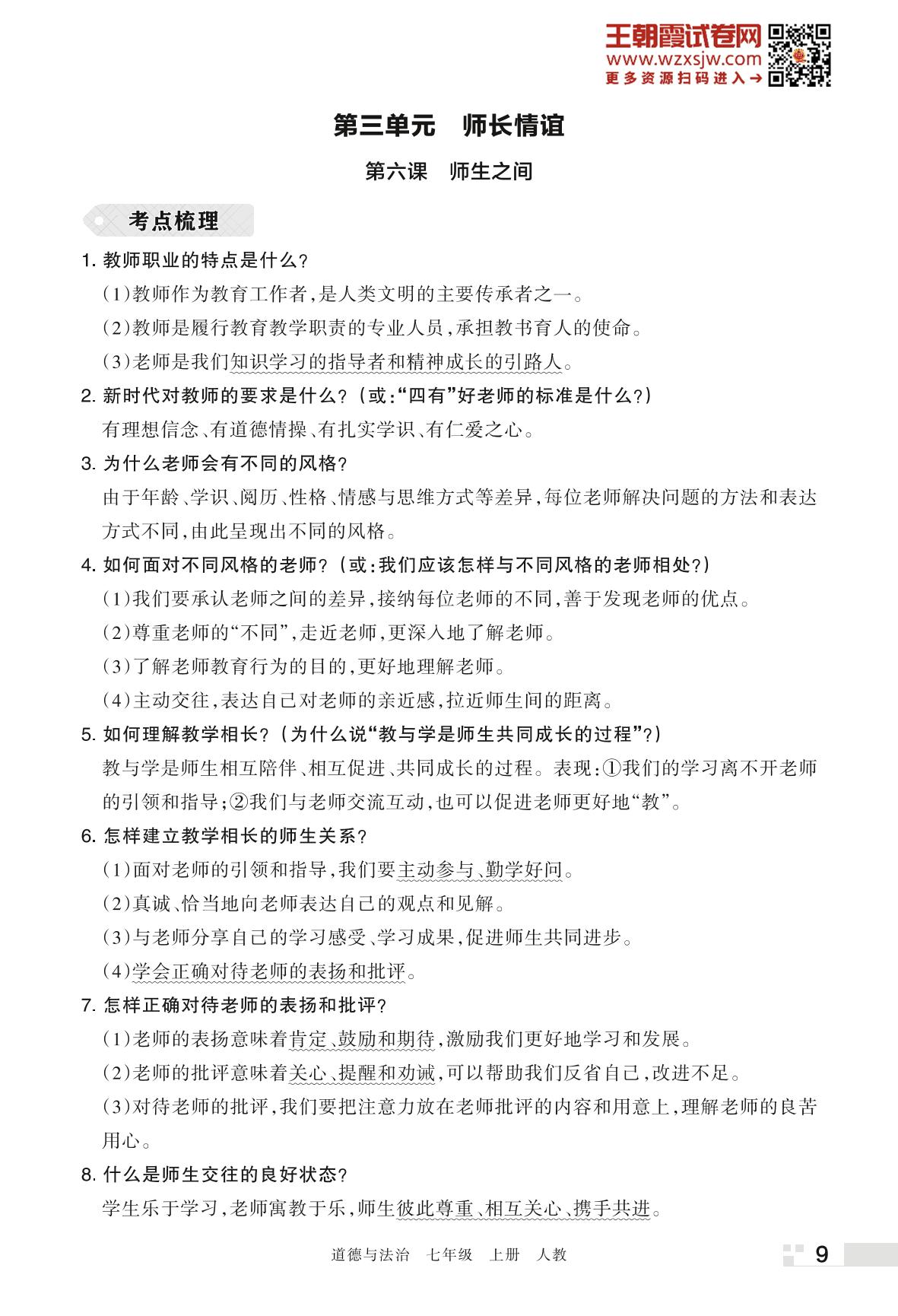 王朝霞期末过课本——第三单元 师长情谊七年级上册道德与法治(人教版)