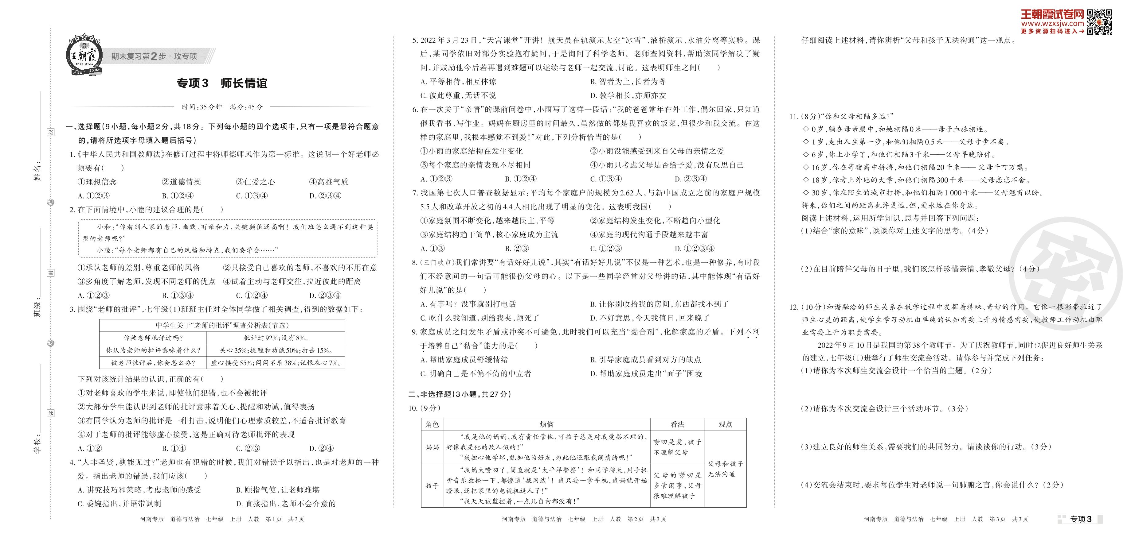 王朝霞期末专项卷——师长情谊七年级上册道德与法治(人教版)_R221116144219073【3】