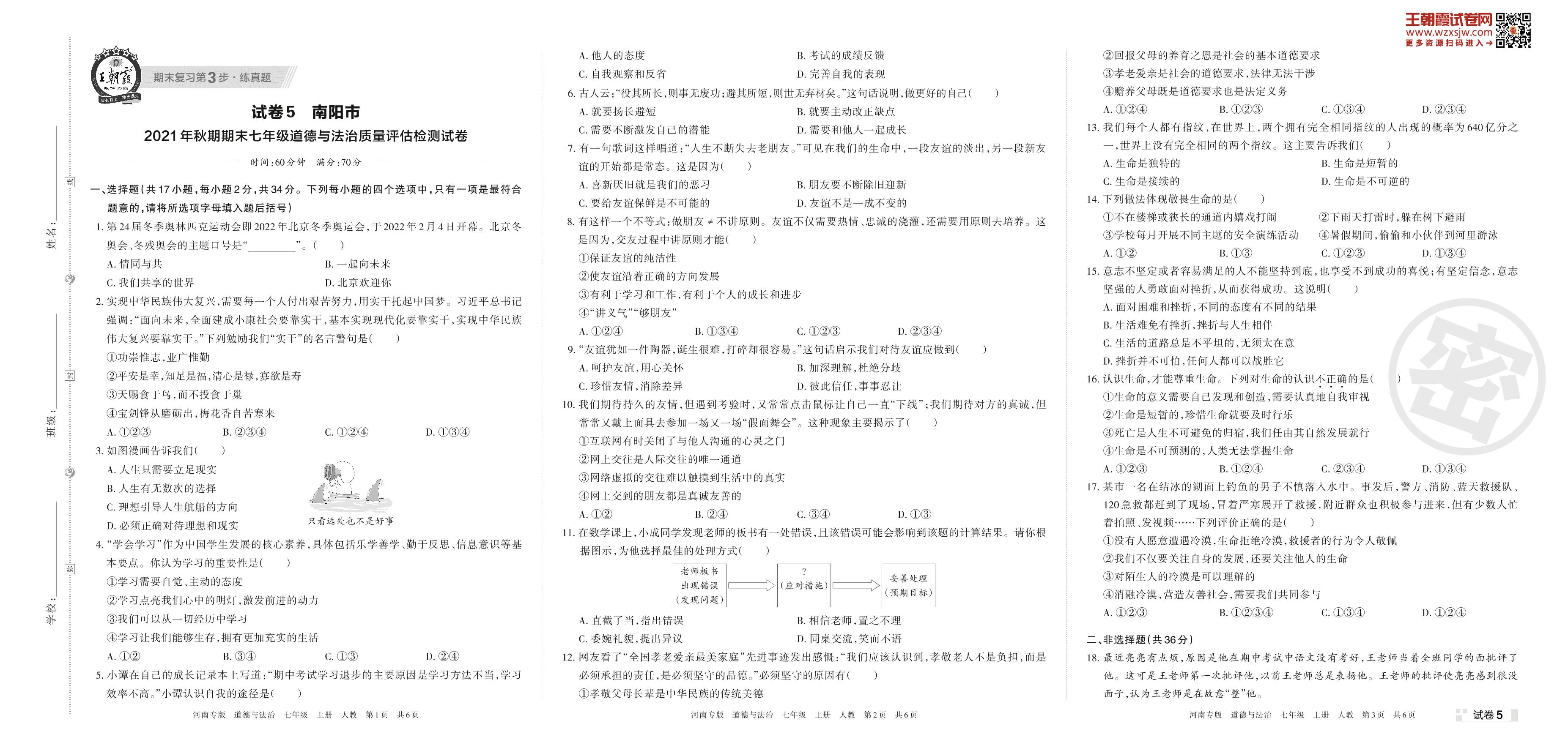 南阳市2021年秋期期末七年级道德与法治质量评估检测试卷(人教版)【5】