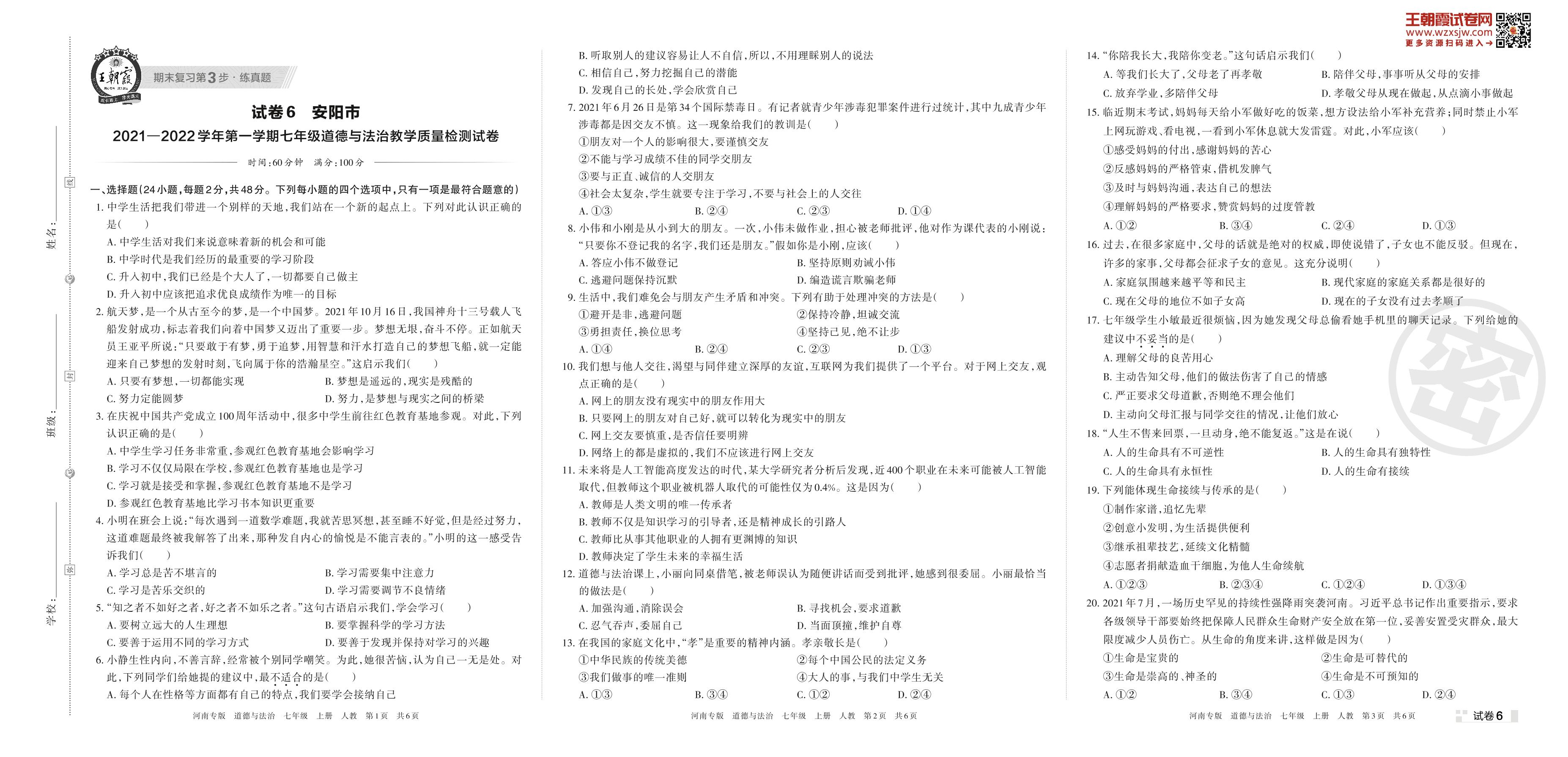 安阳市2021—2022学年第一学期七年级道德与法治教学质量检测试卷(人教版)【6】