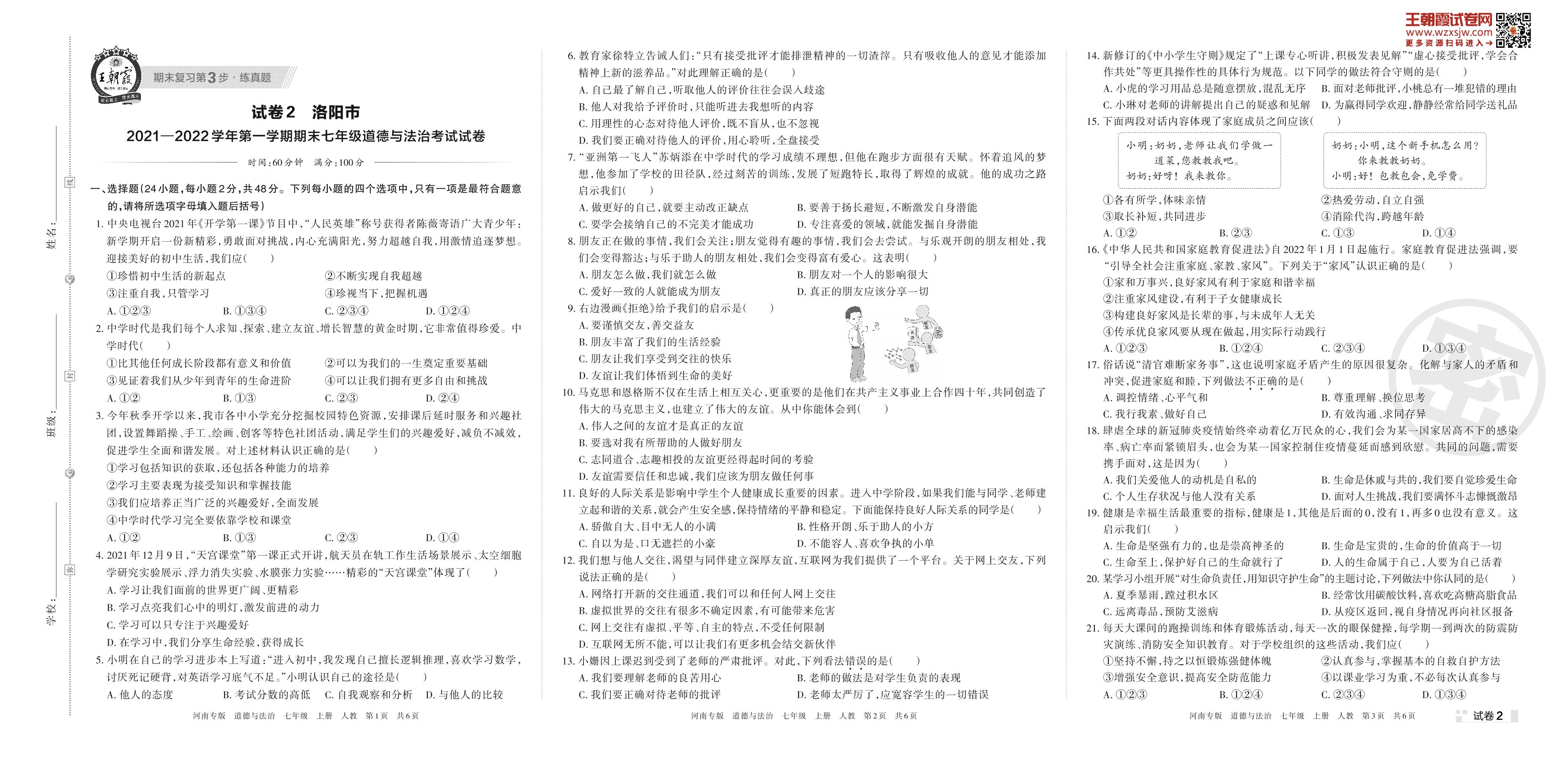 洛阳市2021—2022学年第一学期期末七年级道德与法治考试试卷(人教版)【2】