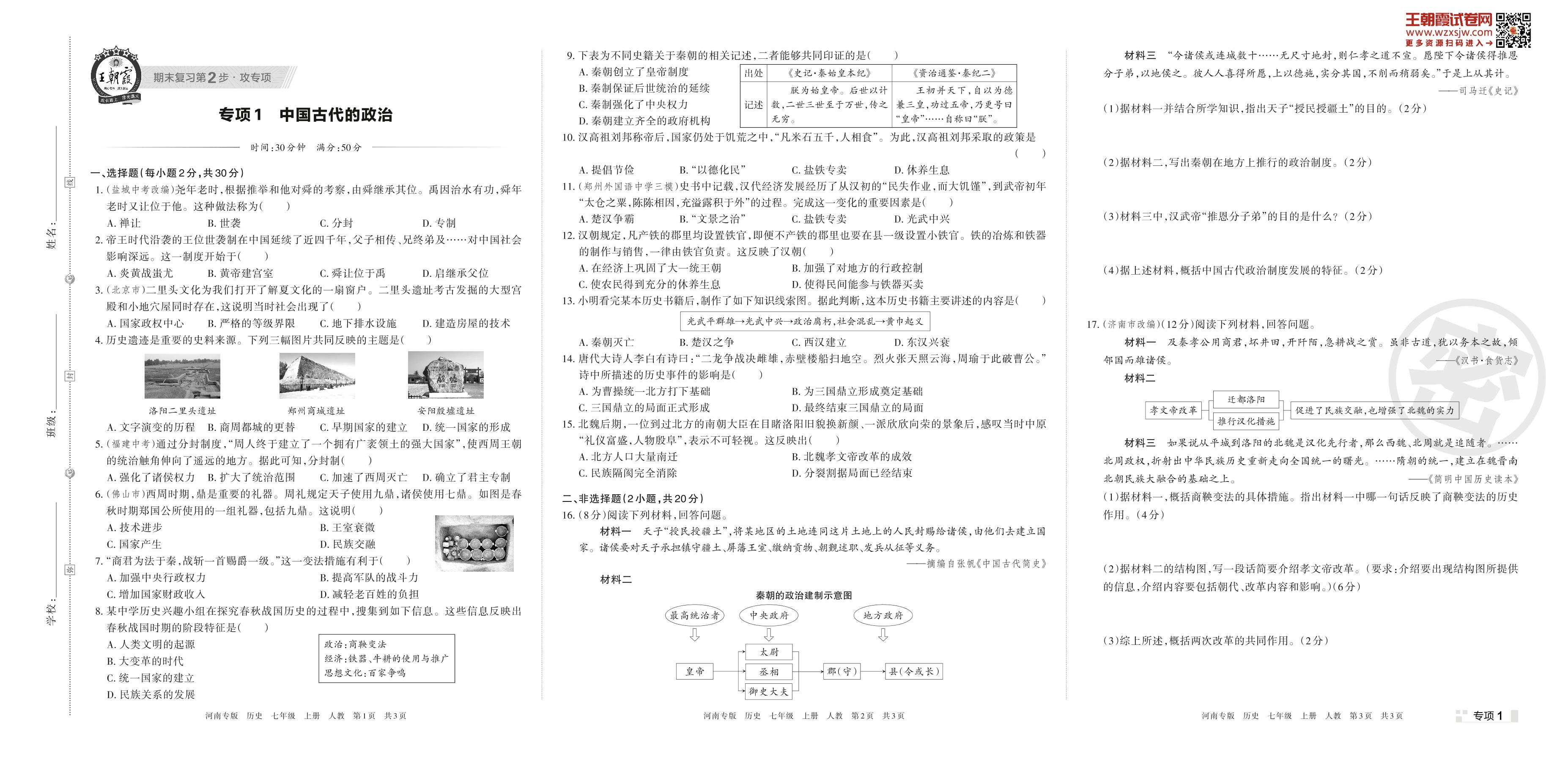 王朝霞期末专项卷——中国古代的政治七年级上册历史(人教版)【1】