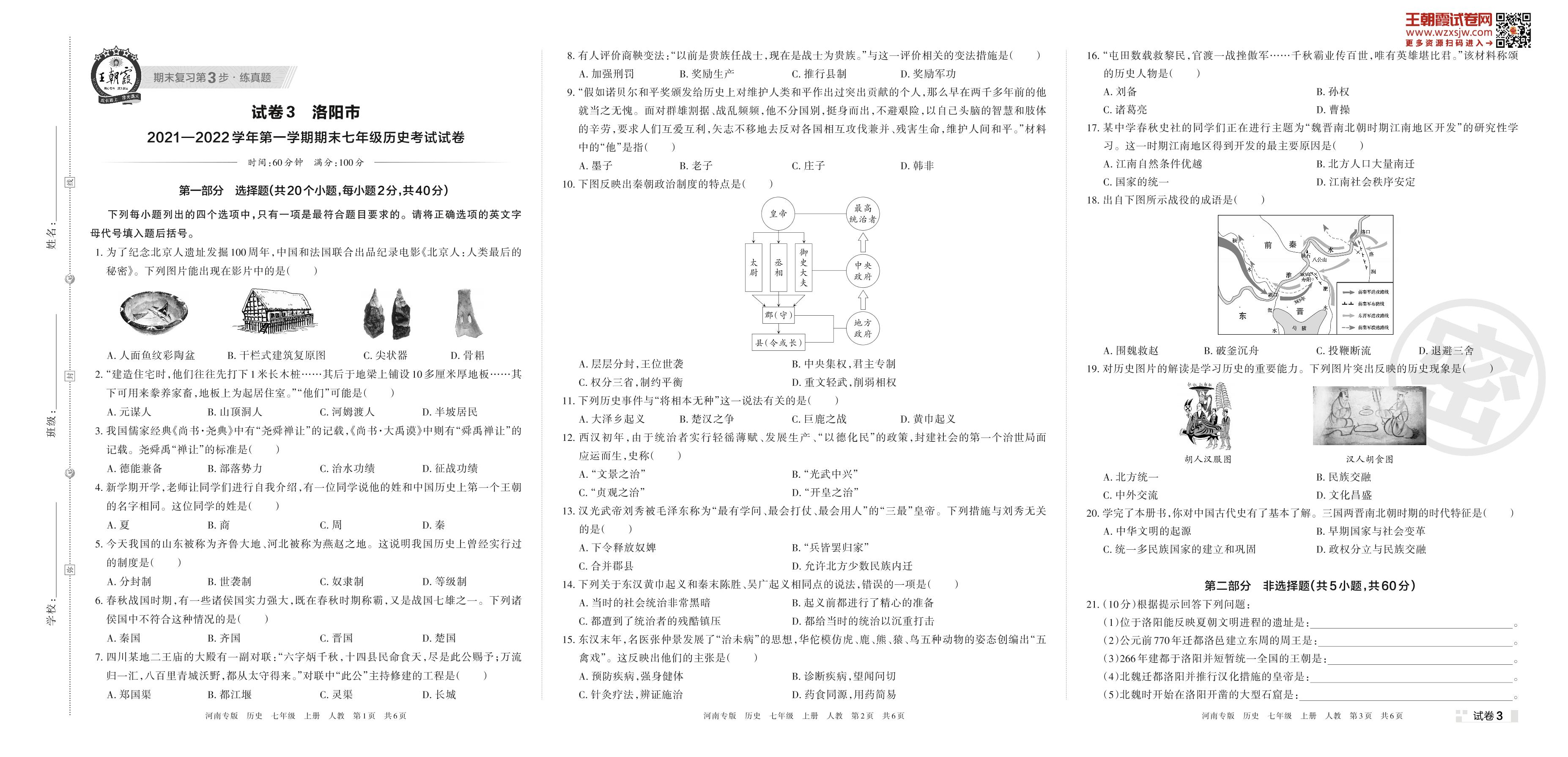 洛阳市2021—2022学年第一学期期末七年级历史考试试卷(人教版)【3】