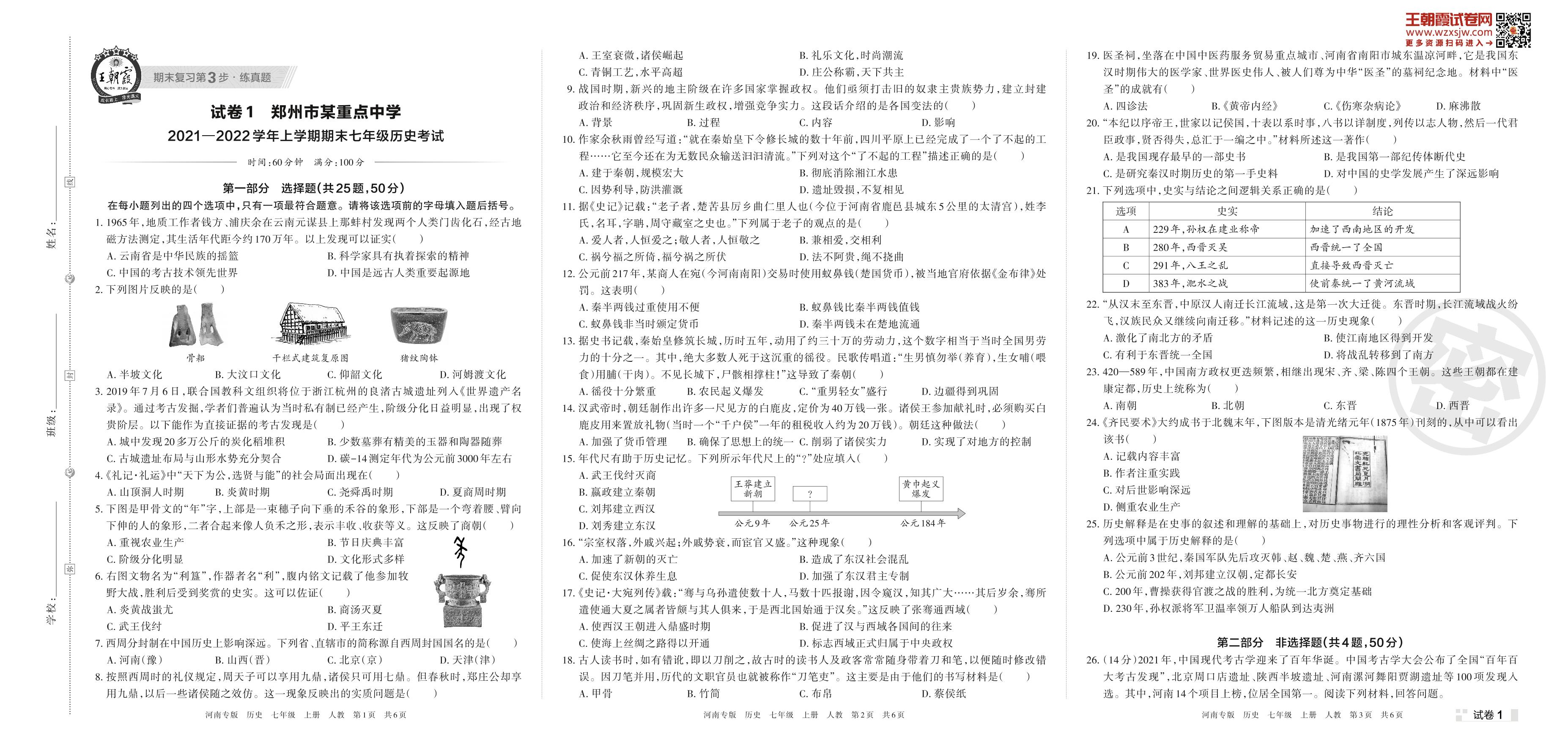 郑州市某重点中学2021—2022学年上学期期末七年级历史考试(人教版)【1】