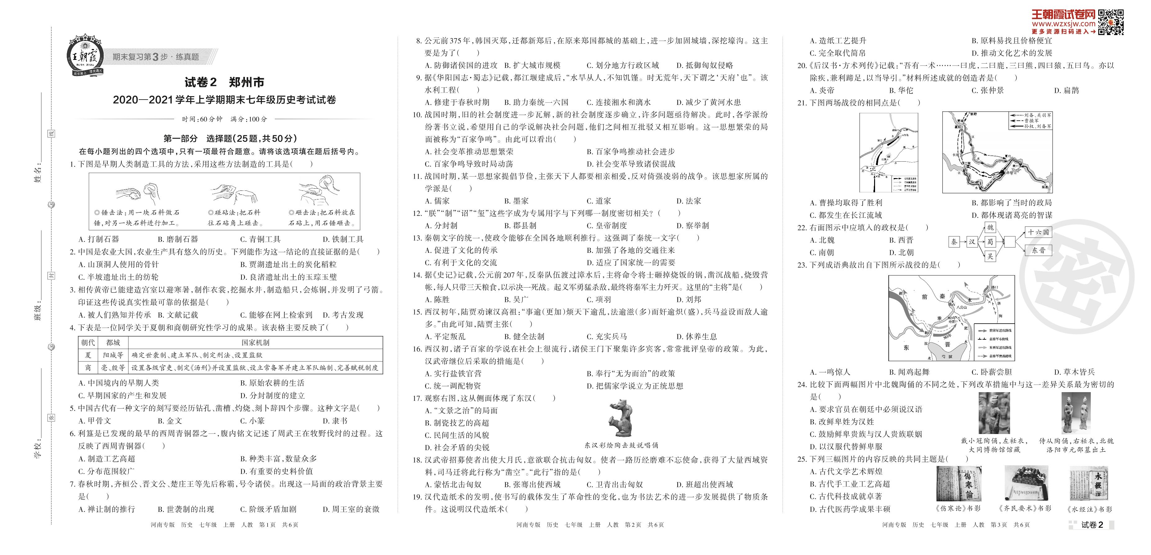 郑州市2020—2021学年上学期期末七年级历史考试试卷(人教版)【2】