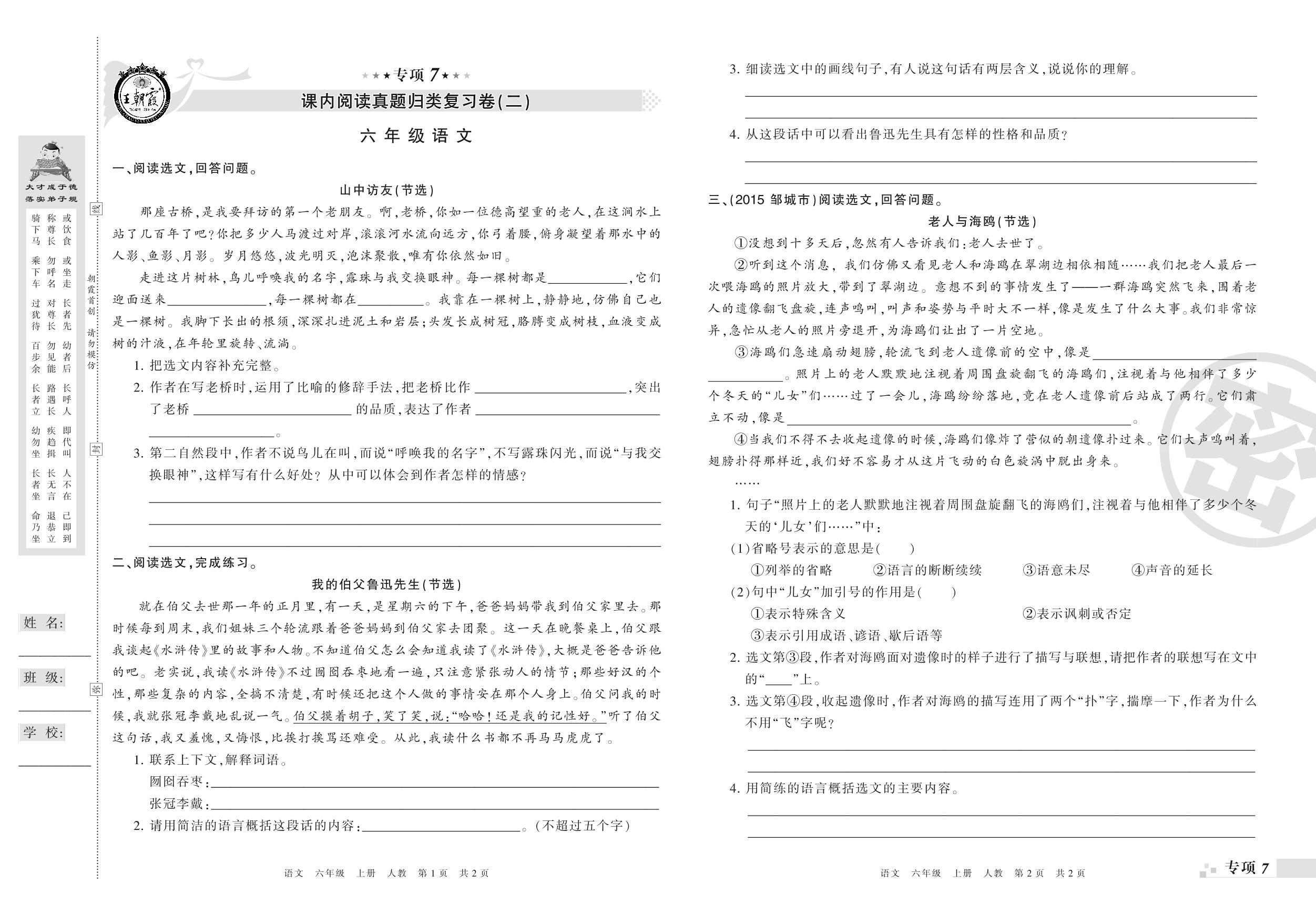 王朝霞期末专项卷——课内阅读(二)、课外阅读与写作真题归类复习卷六年级上册语文(人教版)_R210802114200【0】
