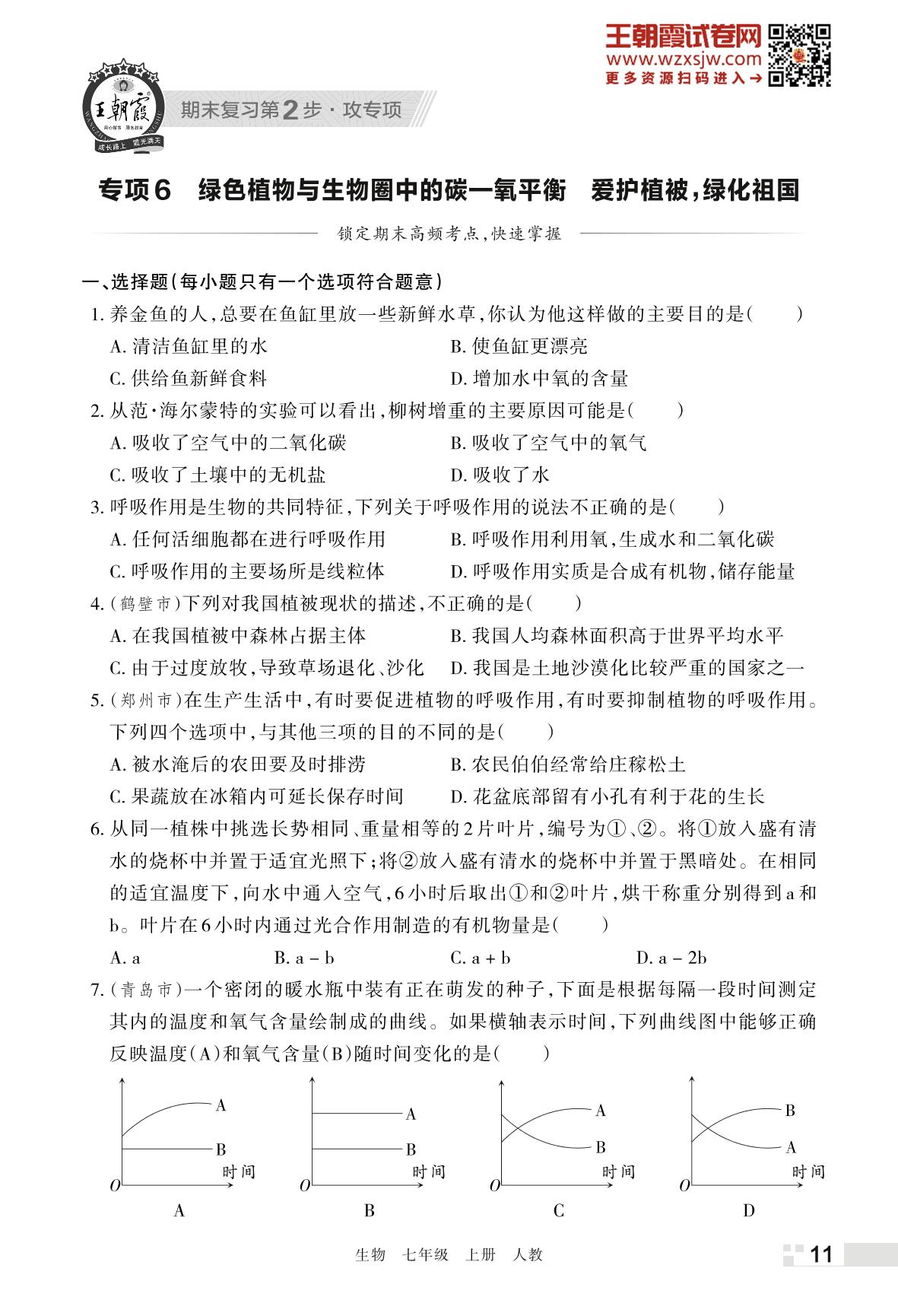 王朝霞期末专项卷——绿色植物与生物圈中的碳一氧平衡 爱护植被,绿化祖国七年级上册生物(人教版)【6】