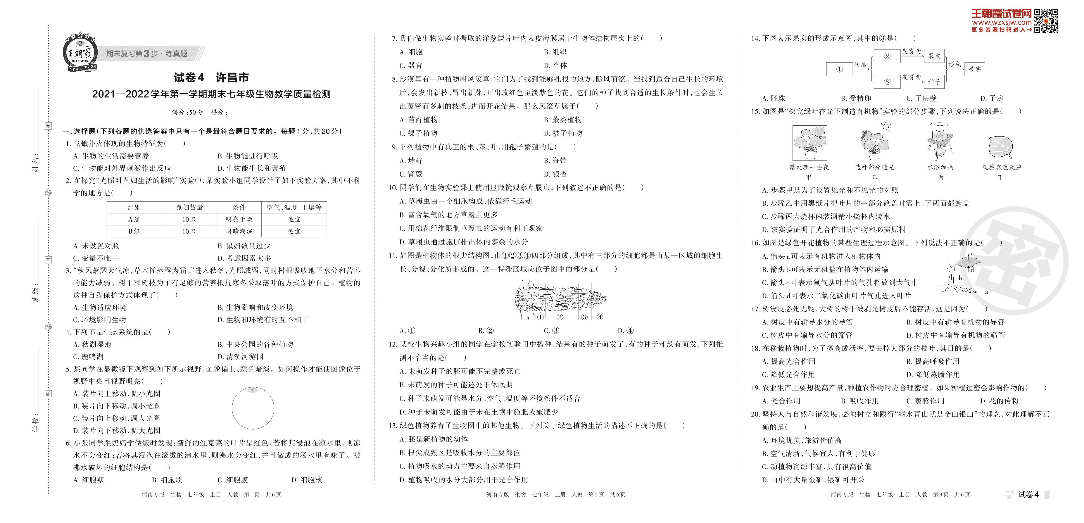 许昌市2021—2022学年第一学期期末七年级生物教学质量检测(人教版)【4】