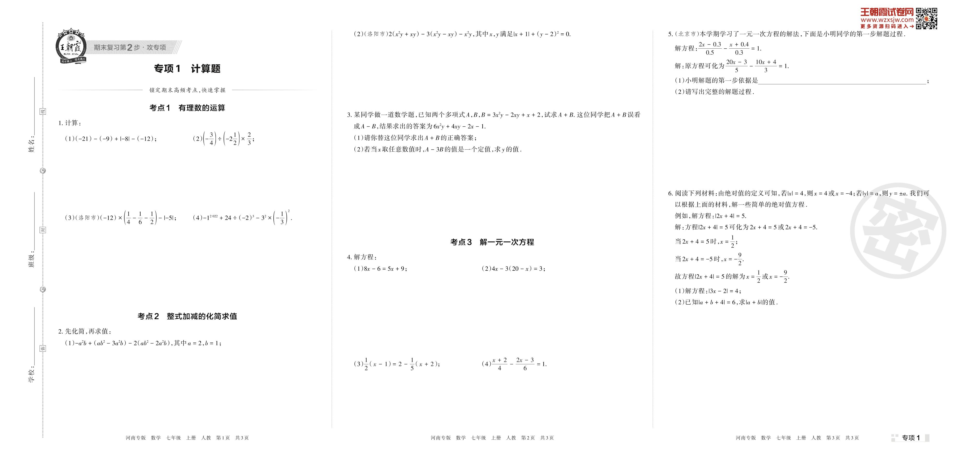 【易考专项】人教版·数学·七年级计算题(一)专项训练